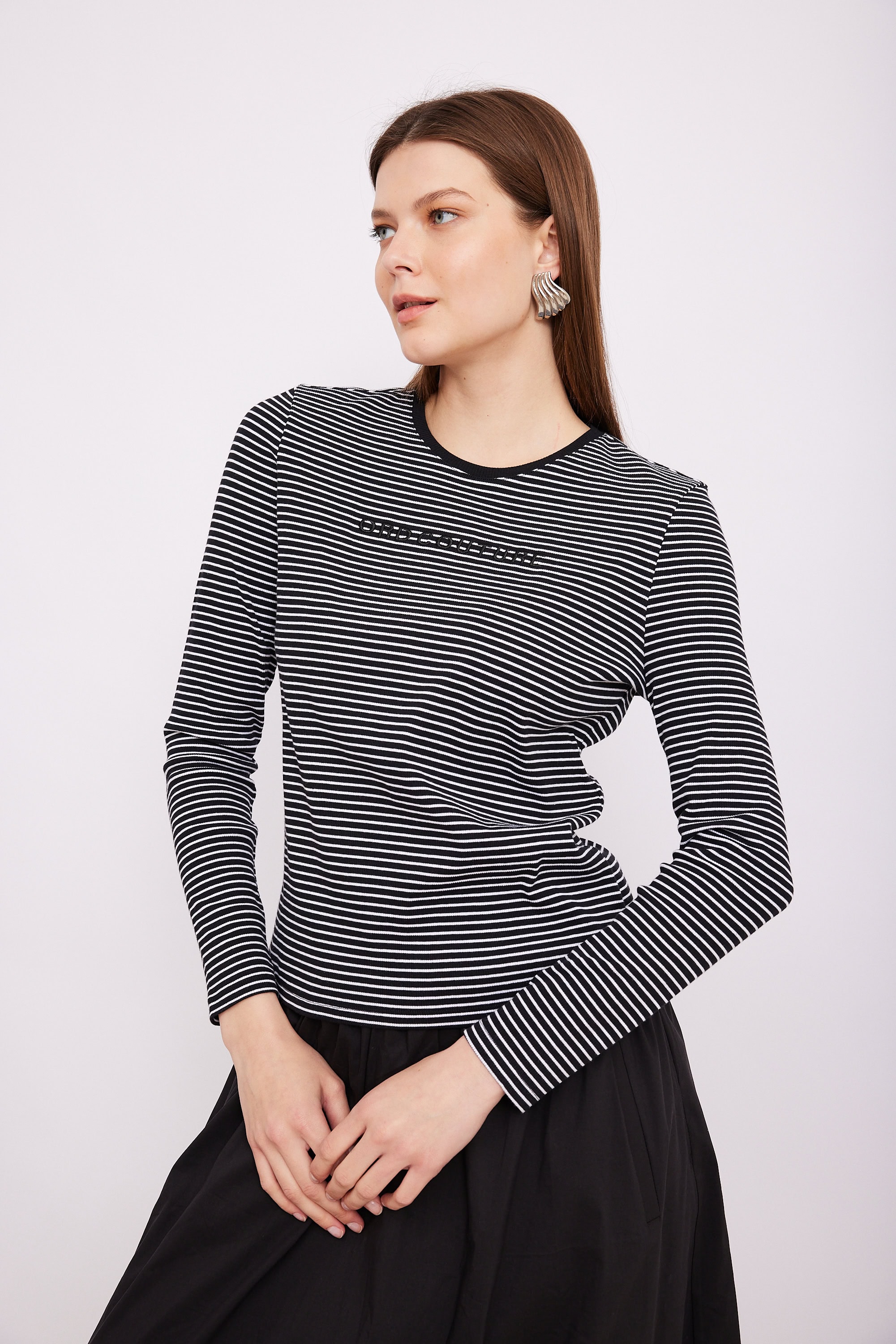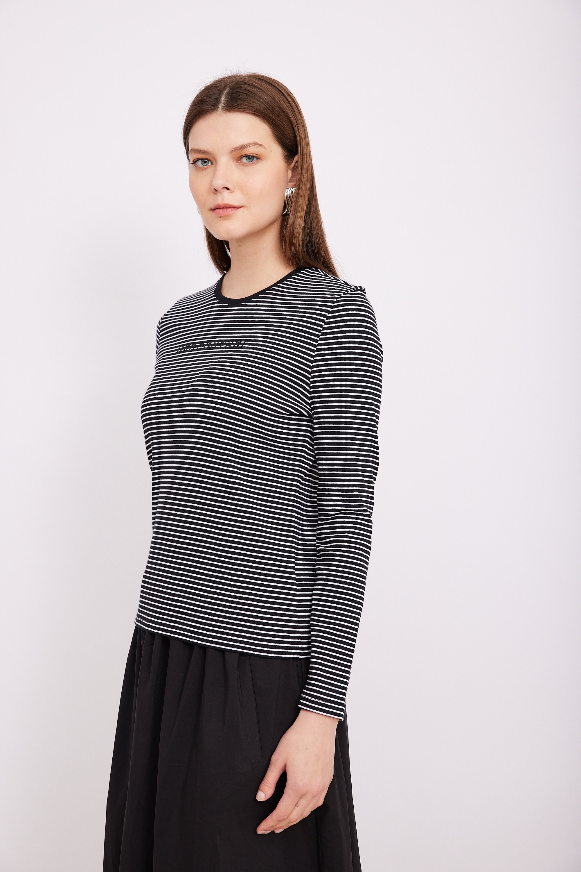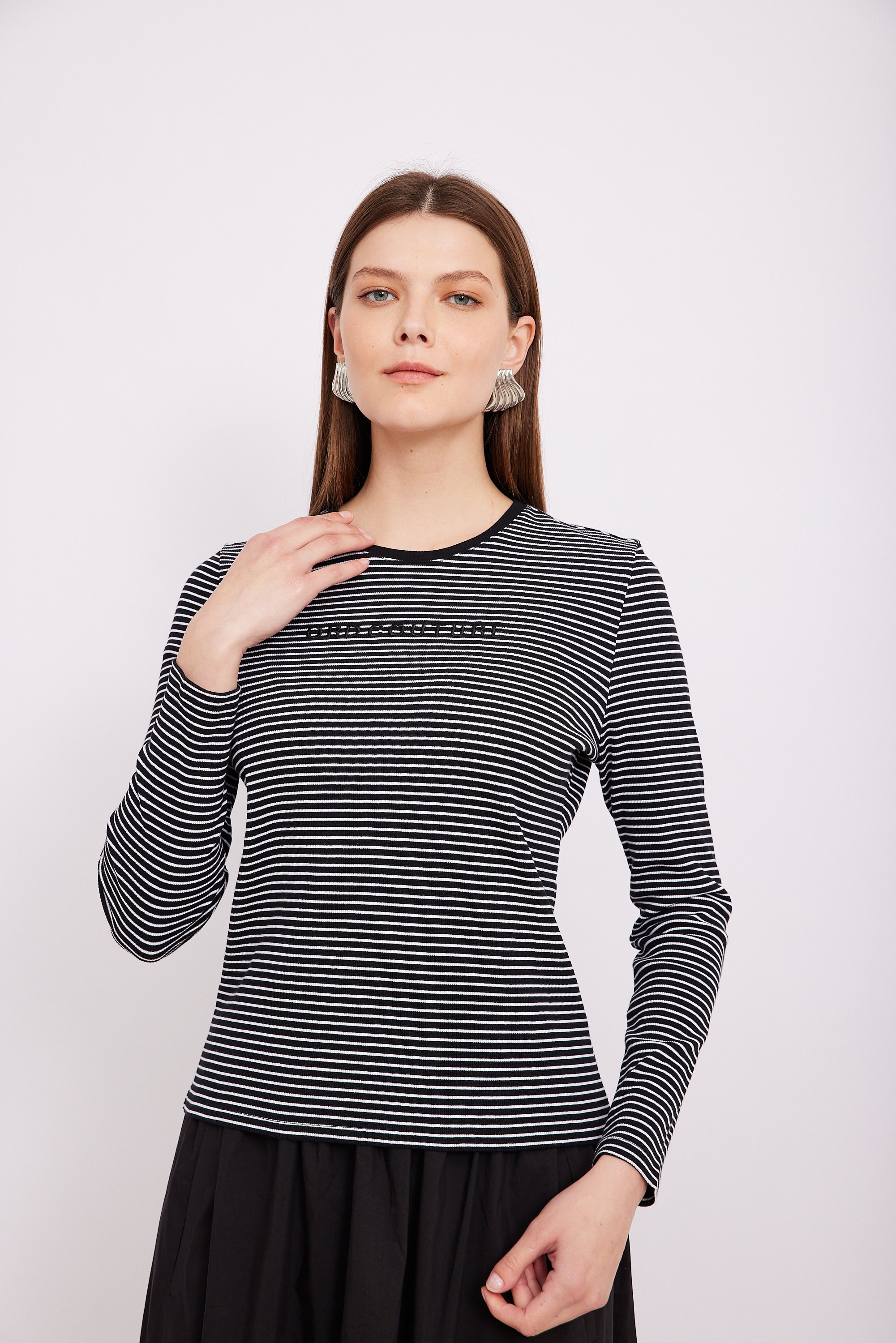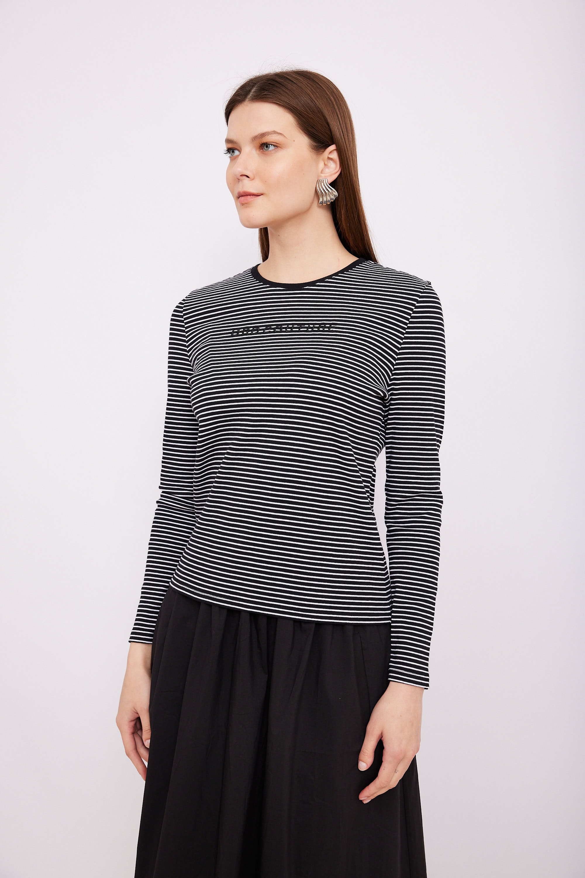 חולצת בייסיק שחור לבן עם כיתוב שחור