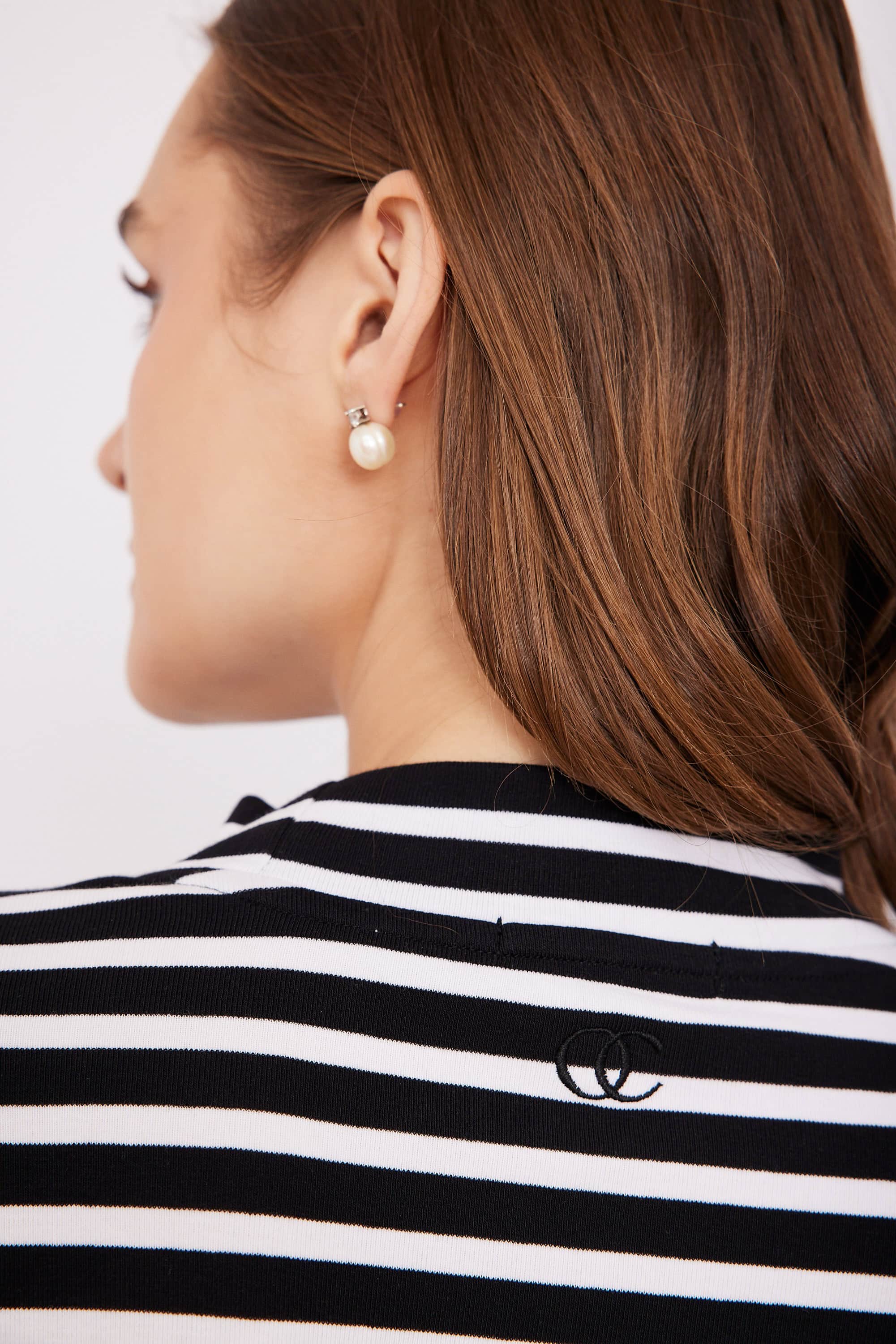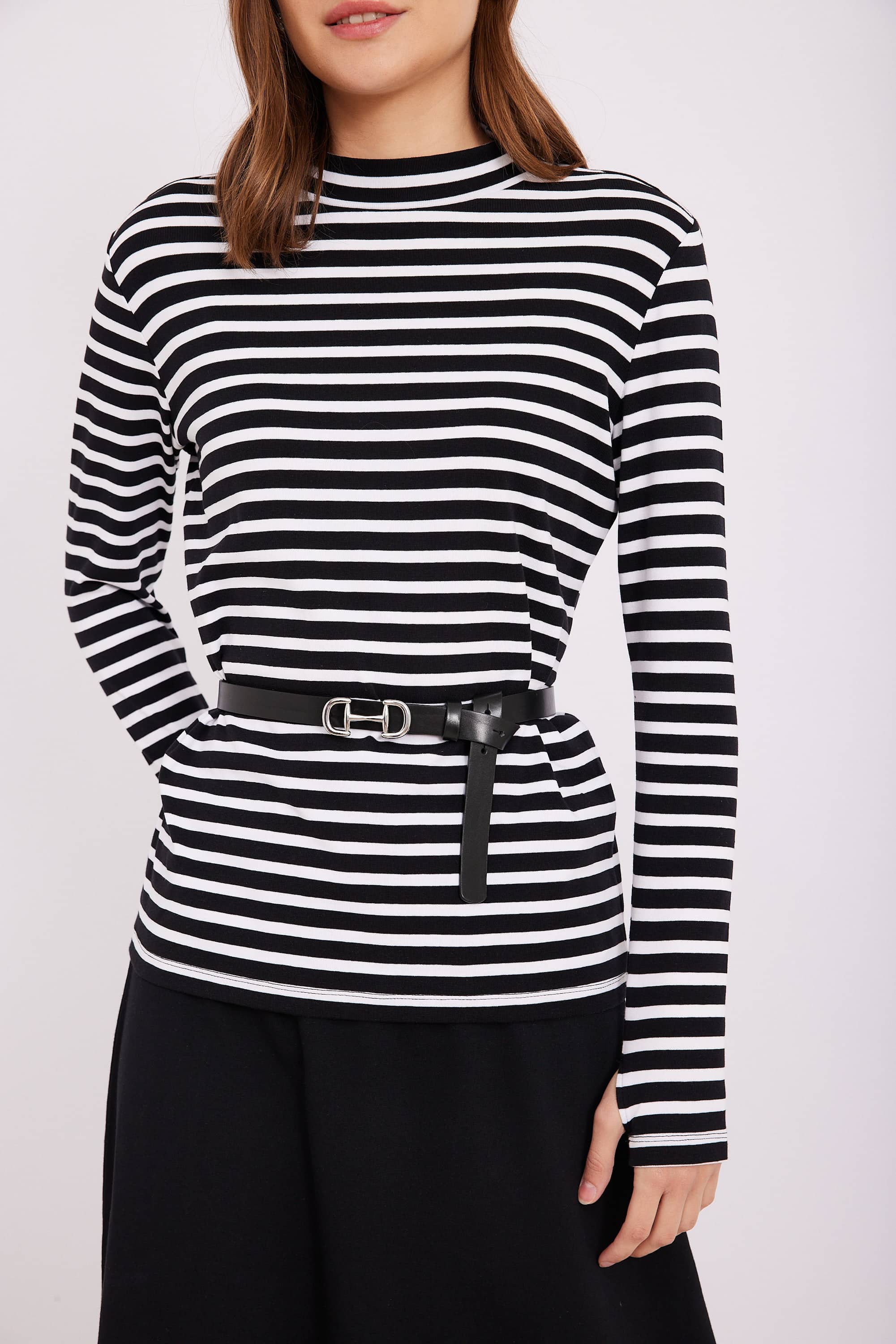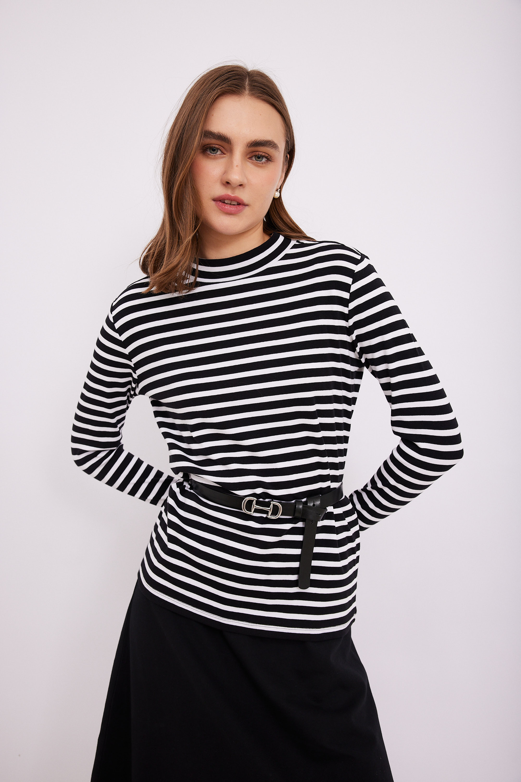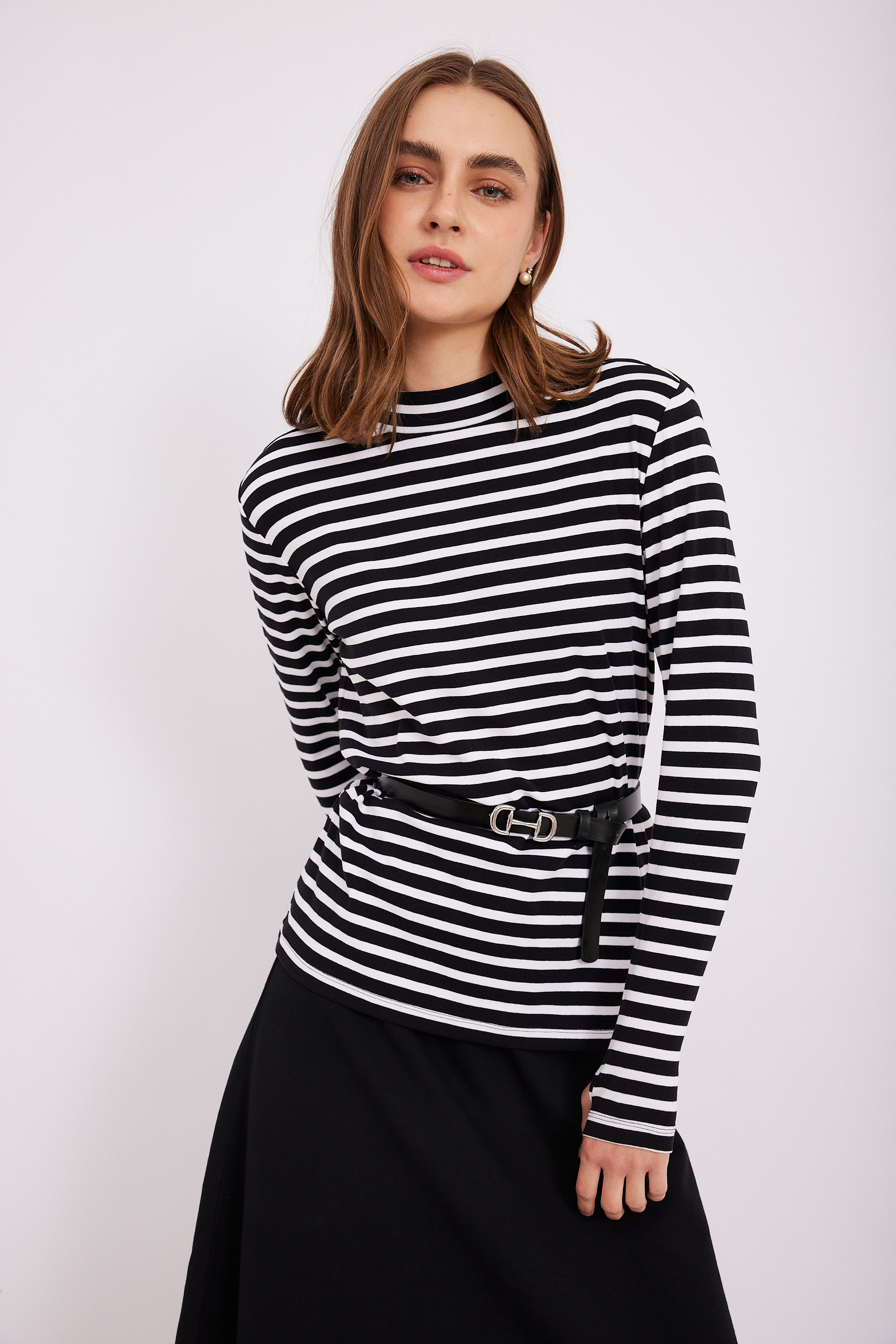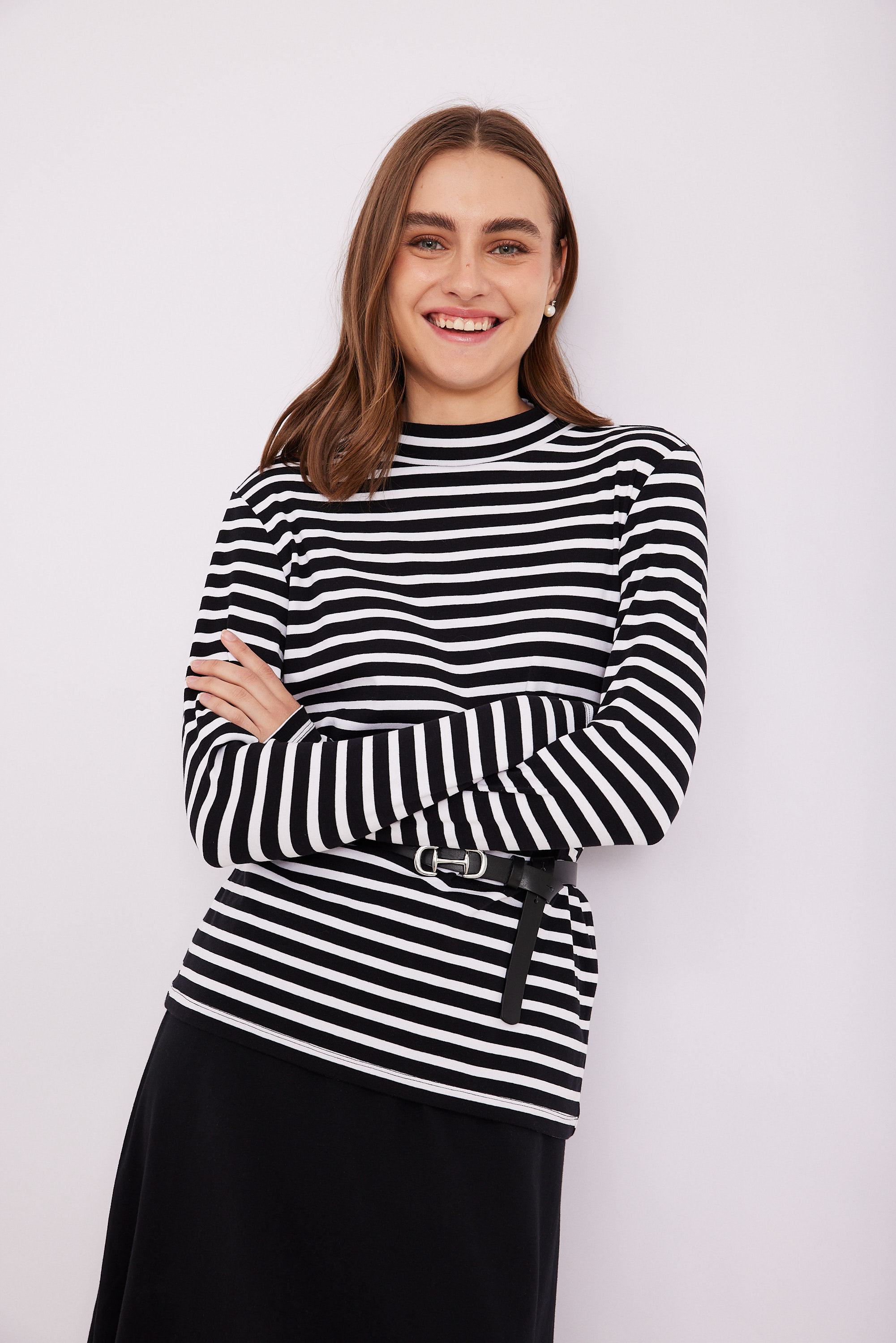 בגזרת פסים קלאסית עם צווארון חצי גולף אלגנטי.