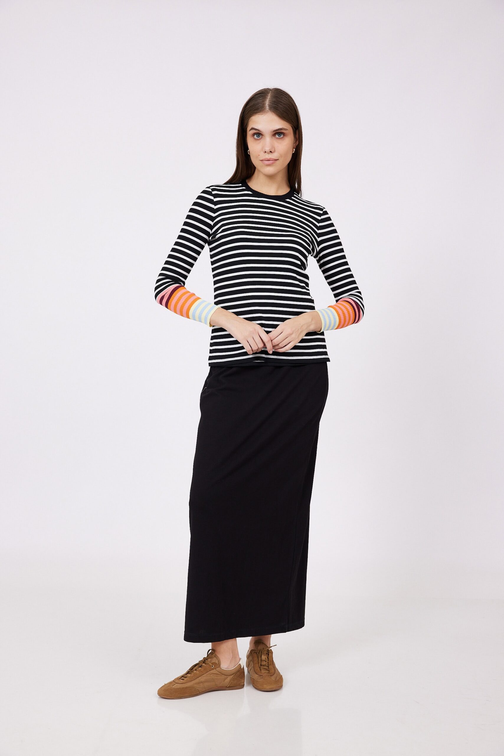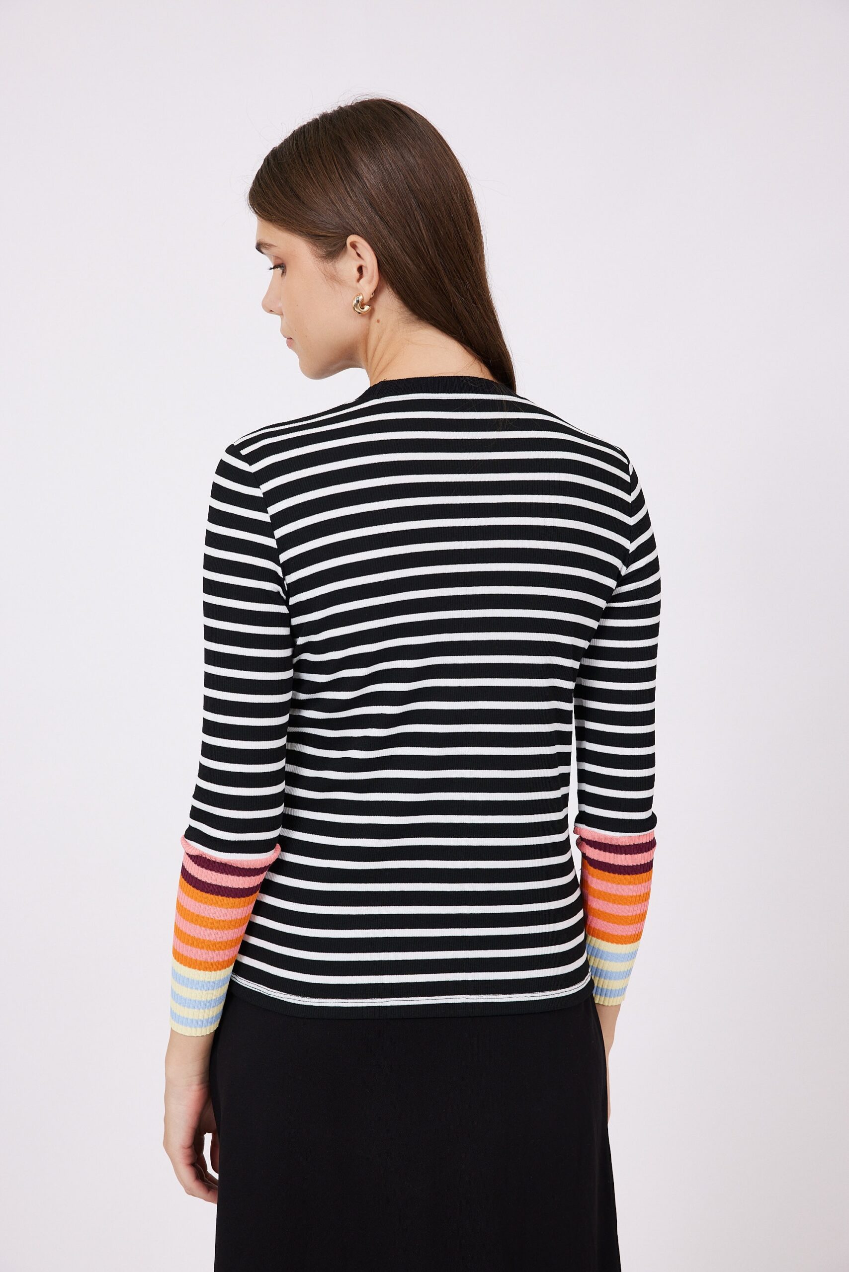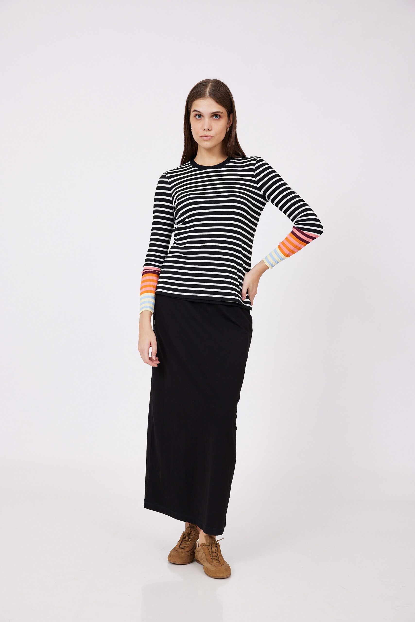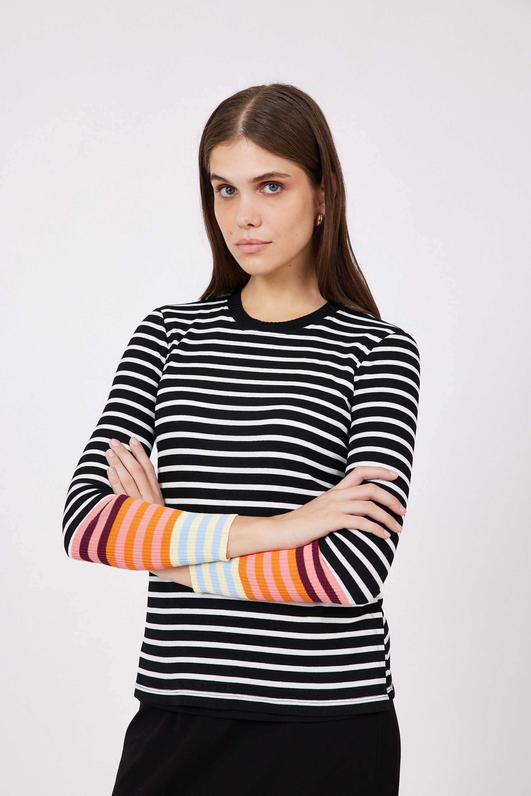 חולצת הנקה פסים בשחור-לבן, עם שרוולים צבעוניים שנותנים טוויסט כיפי ומלא חיים.