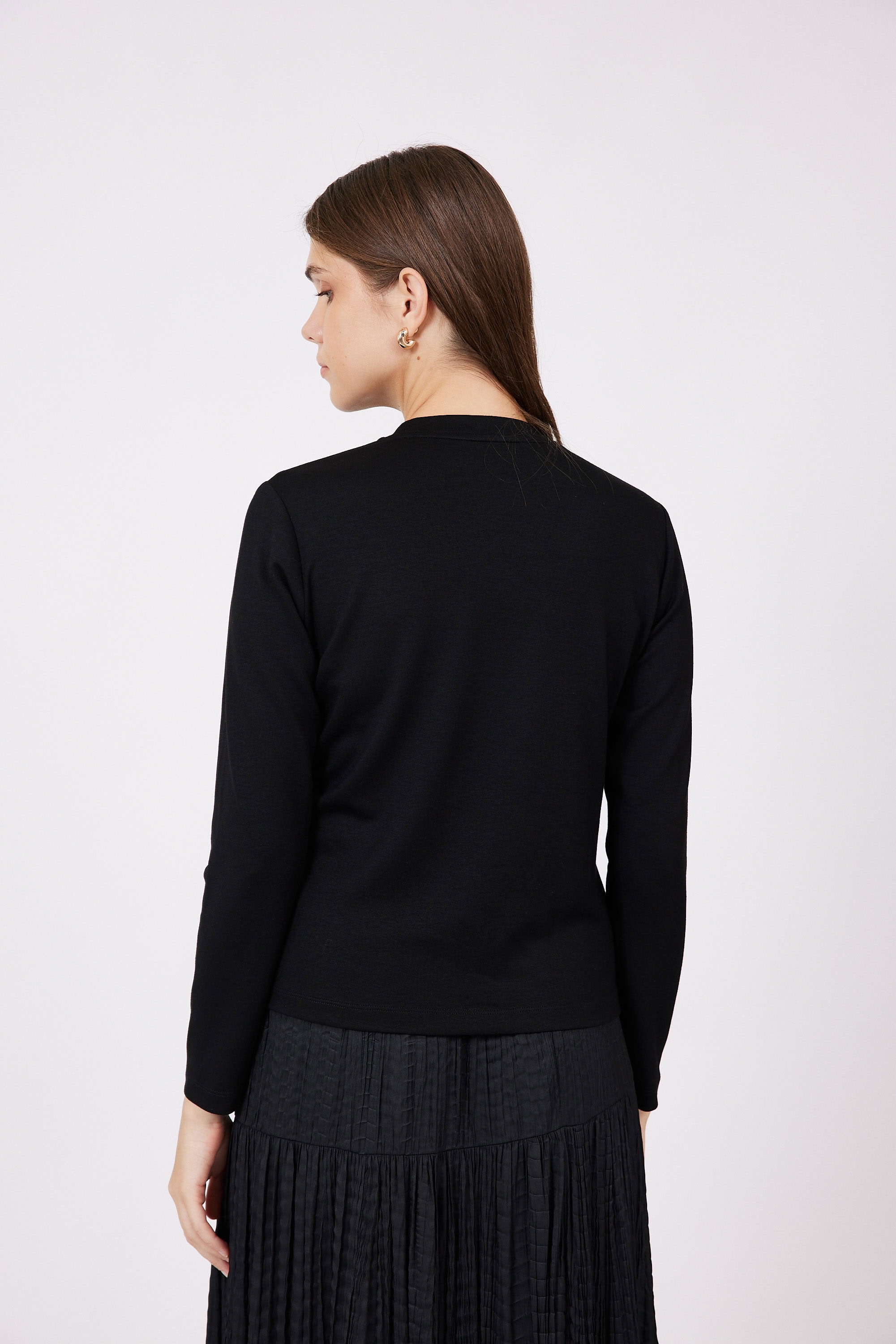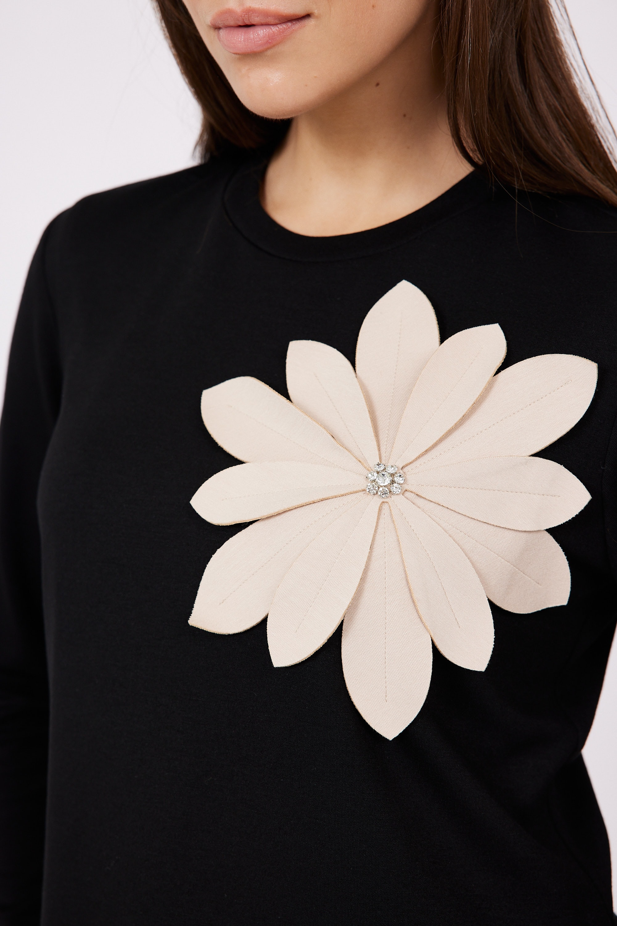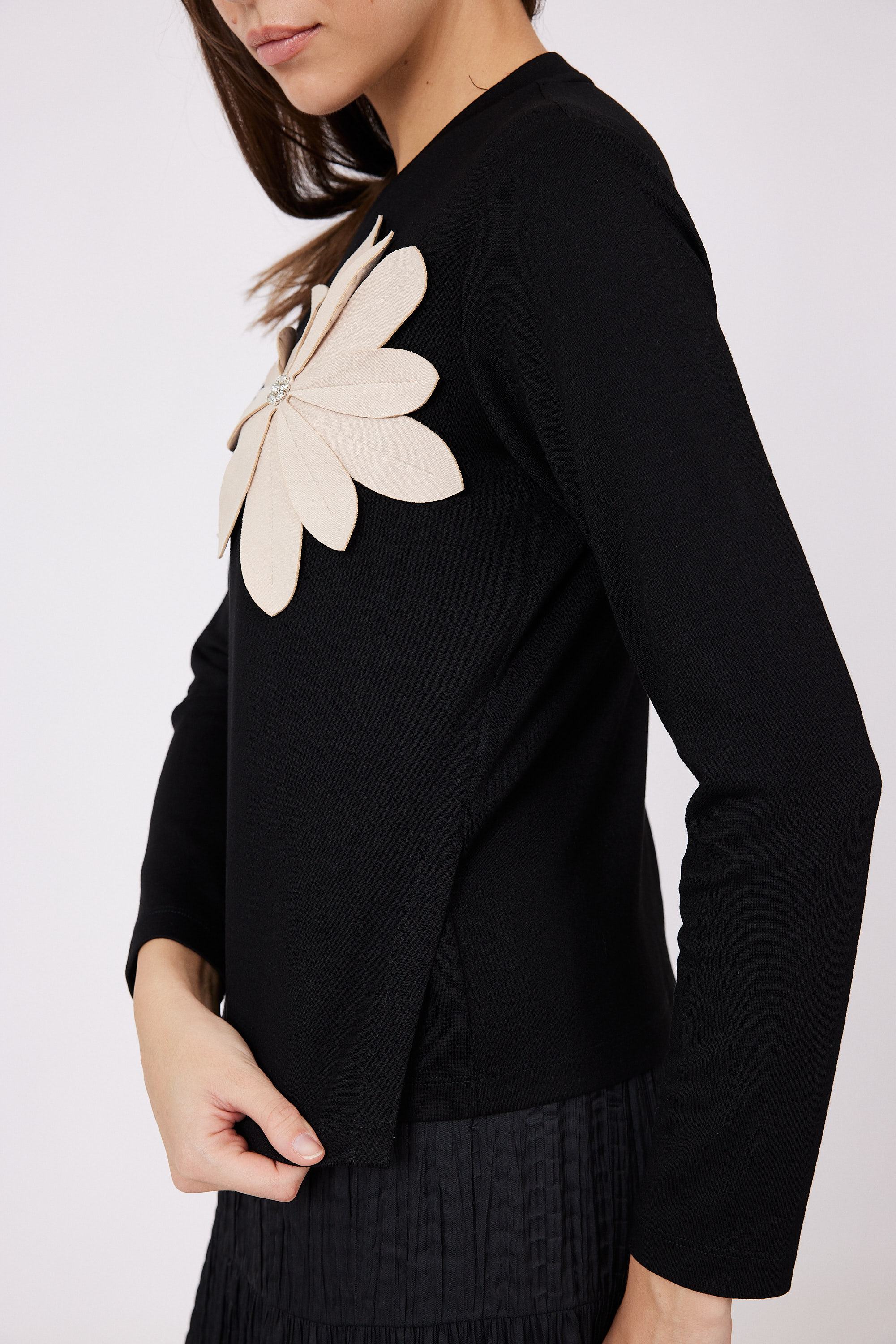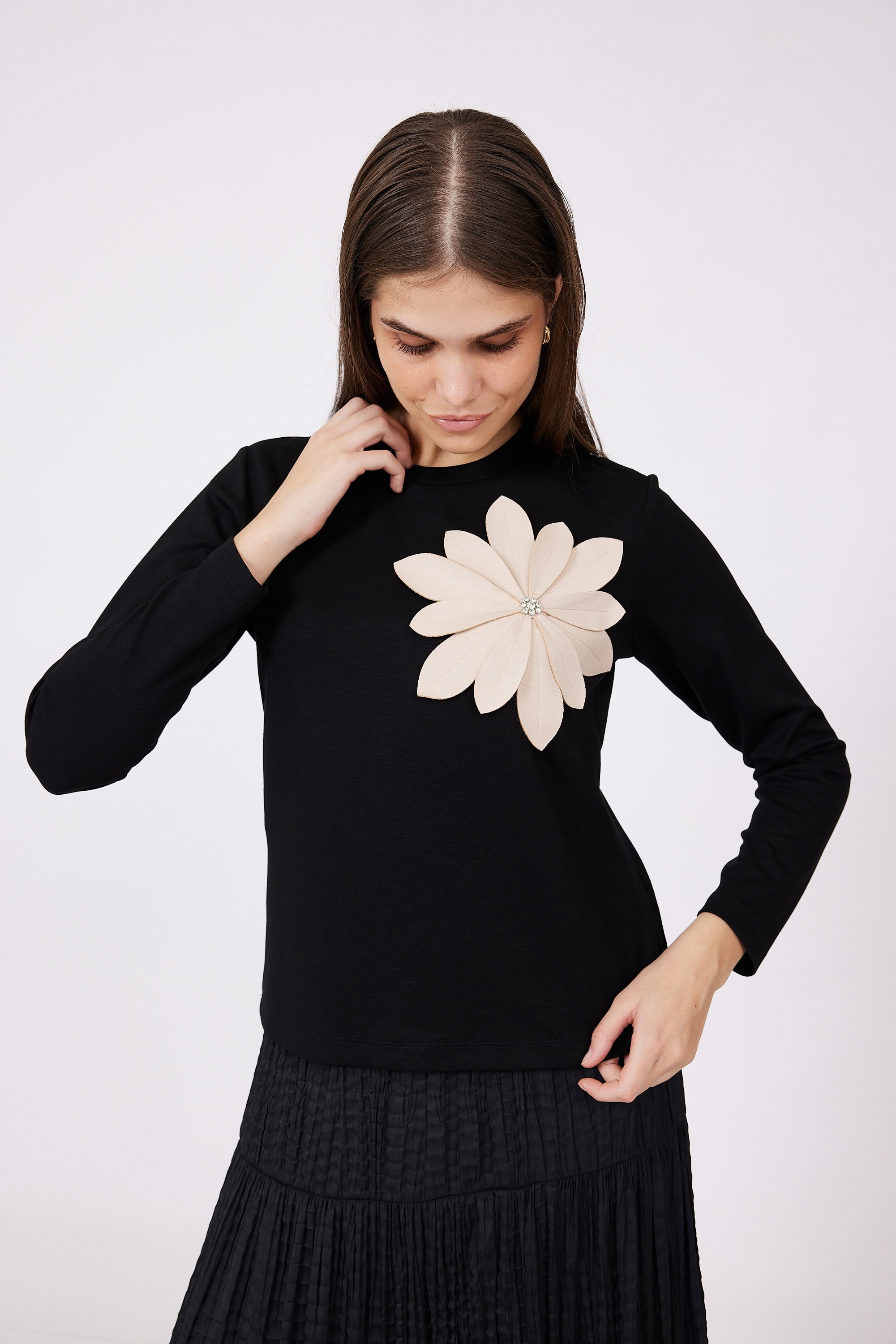 חולצת הנקה שחורה ומלאת סטייל, עם פרח תלת-ממדי בצבע שמנת שמוסיף טאץ’ מיוחד.