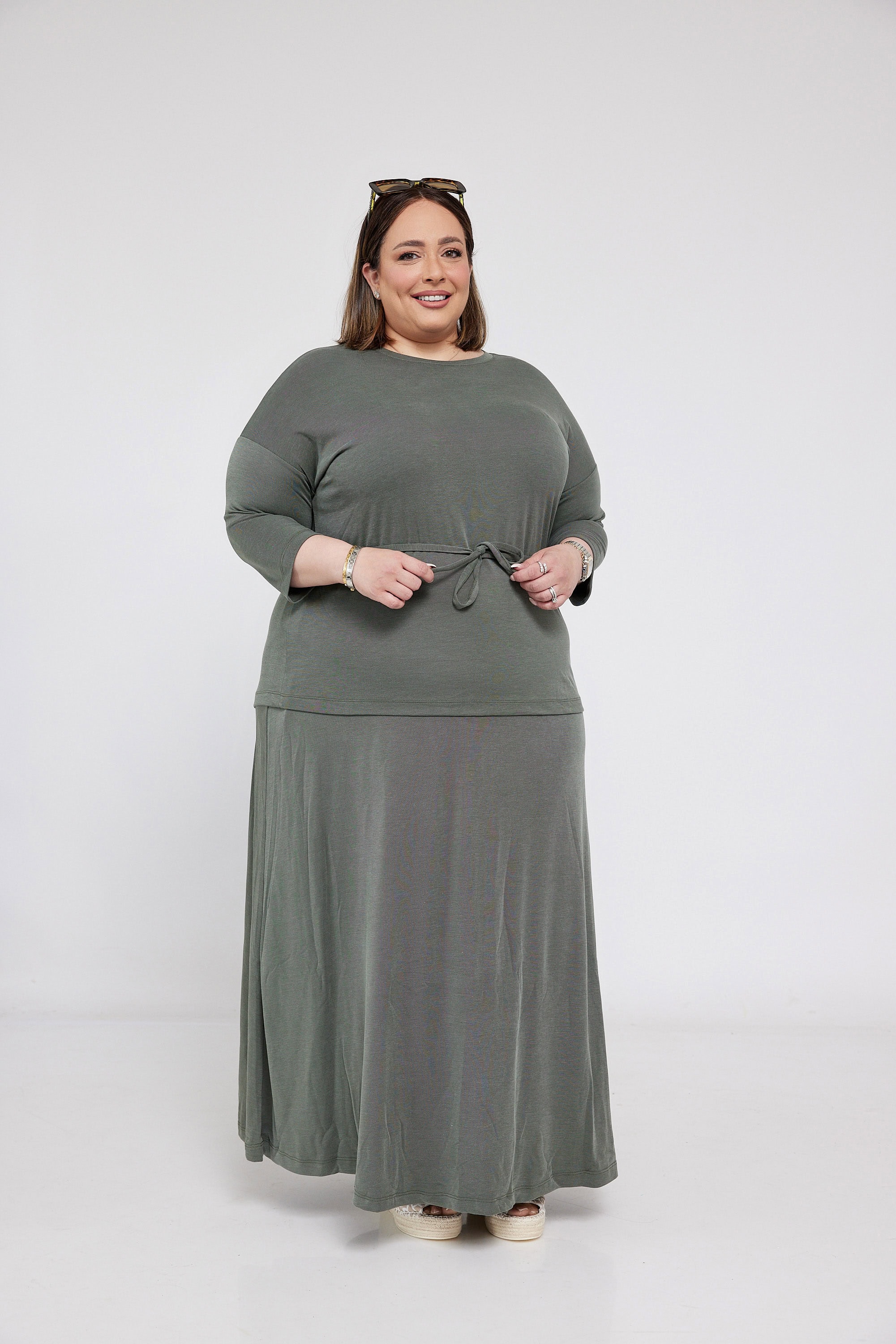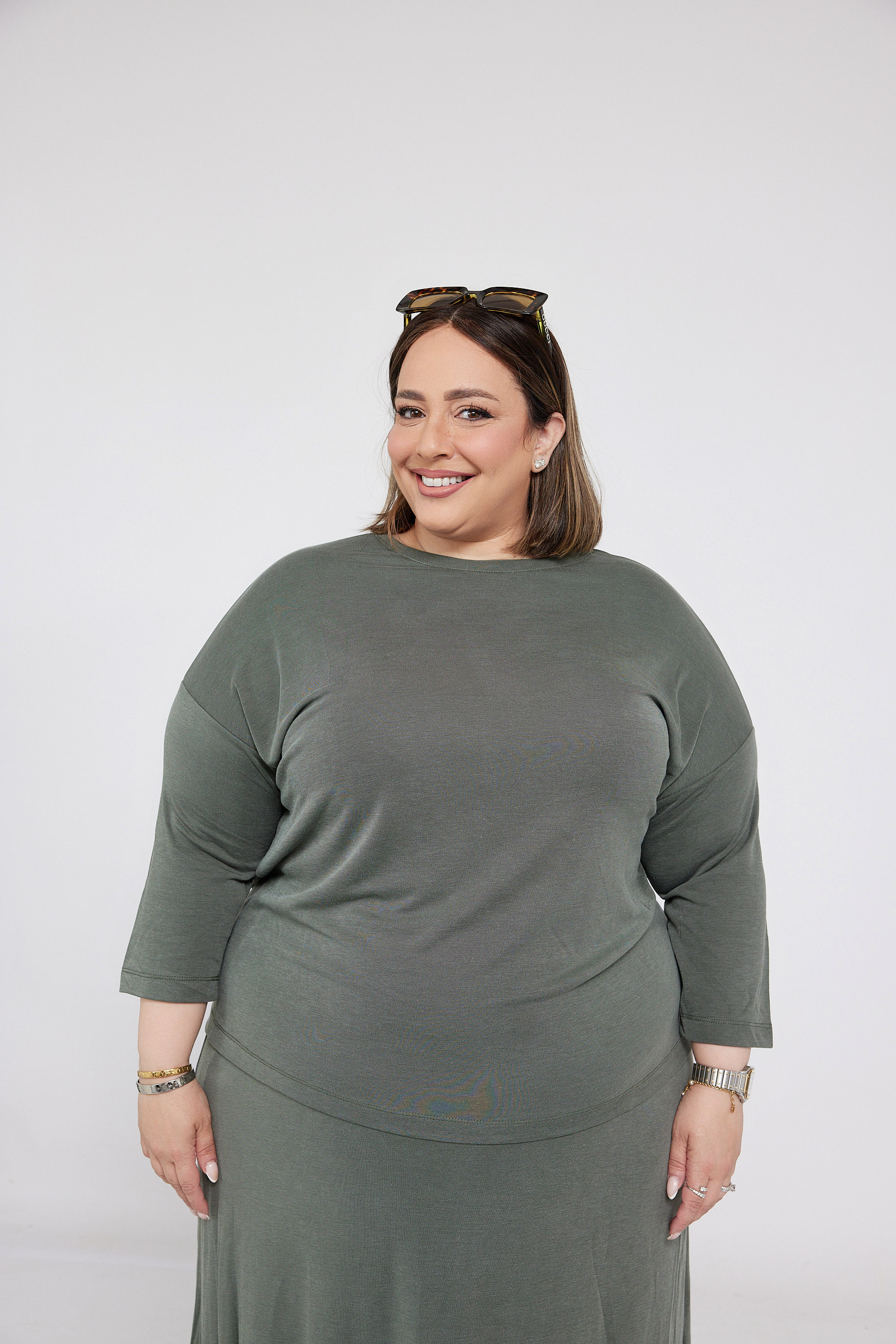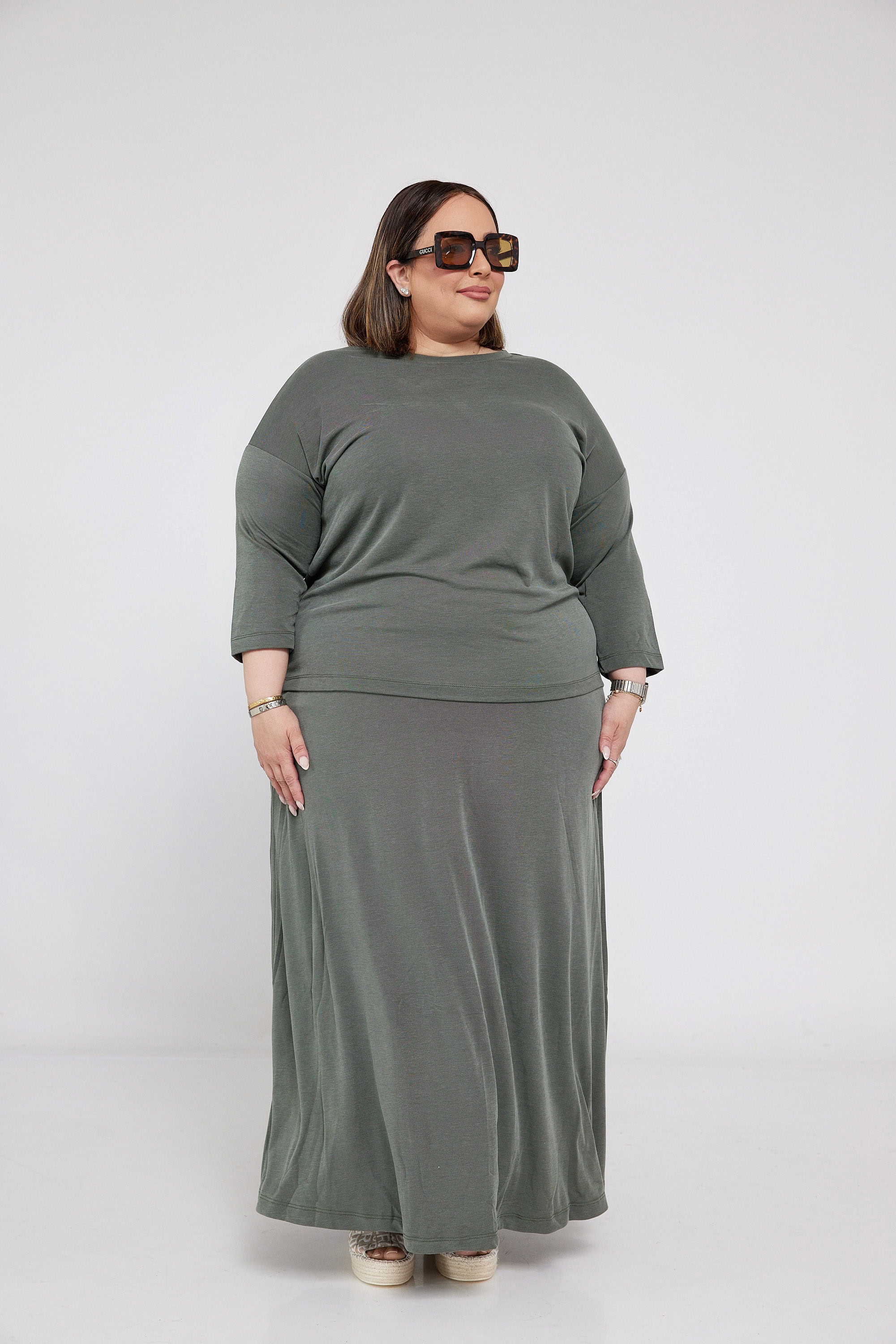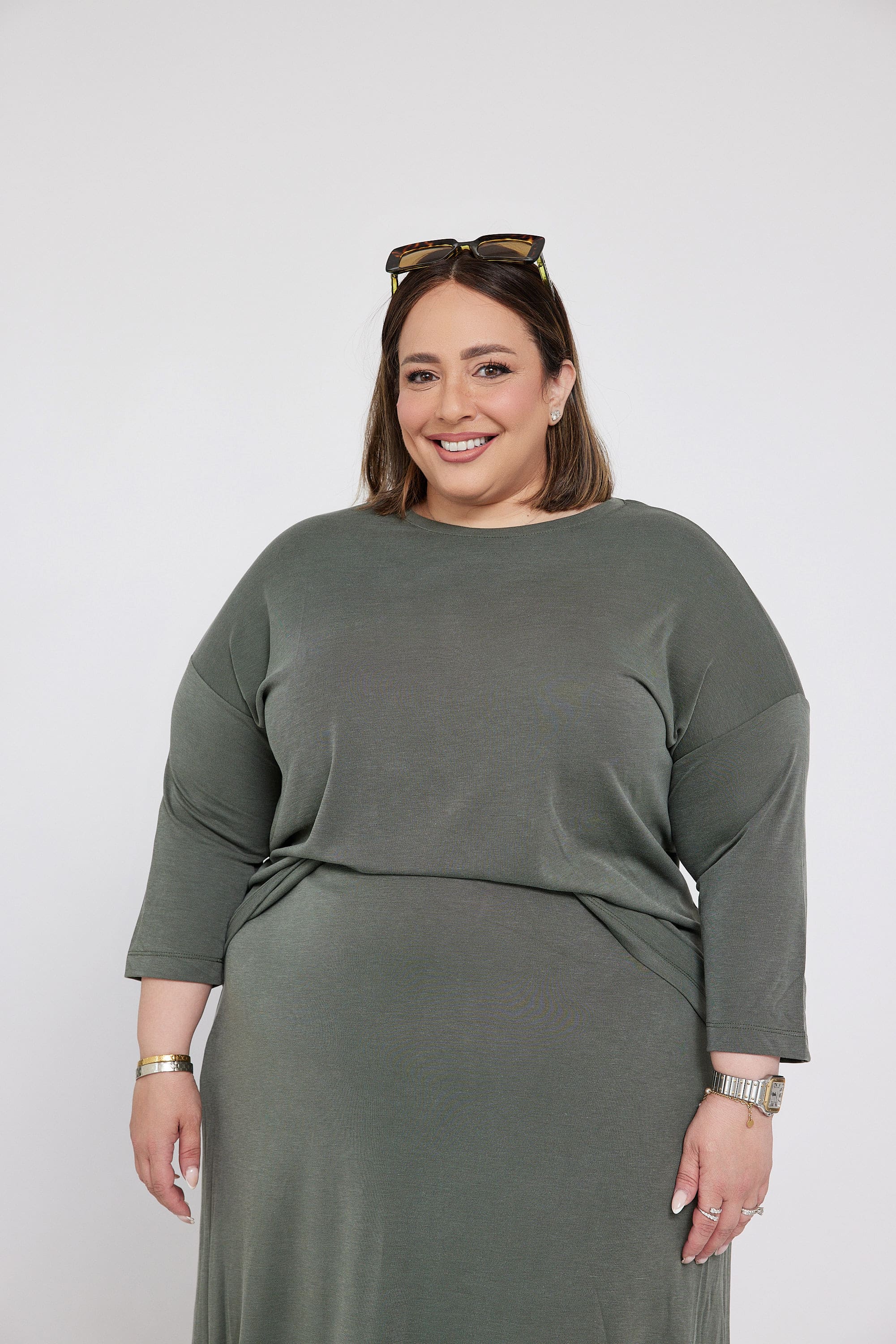 חולצה נוחה ומחמיאה, עשויה מאותו בד לקוסט חלק ואיכותי של החצאית התואמת.