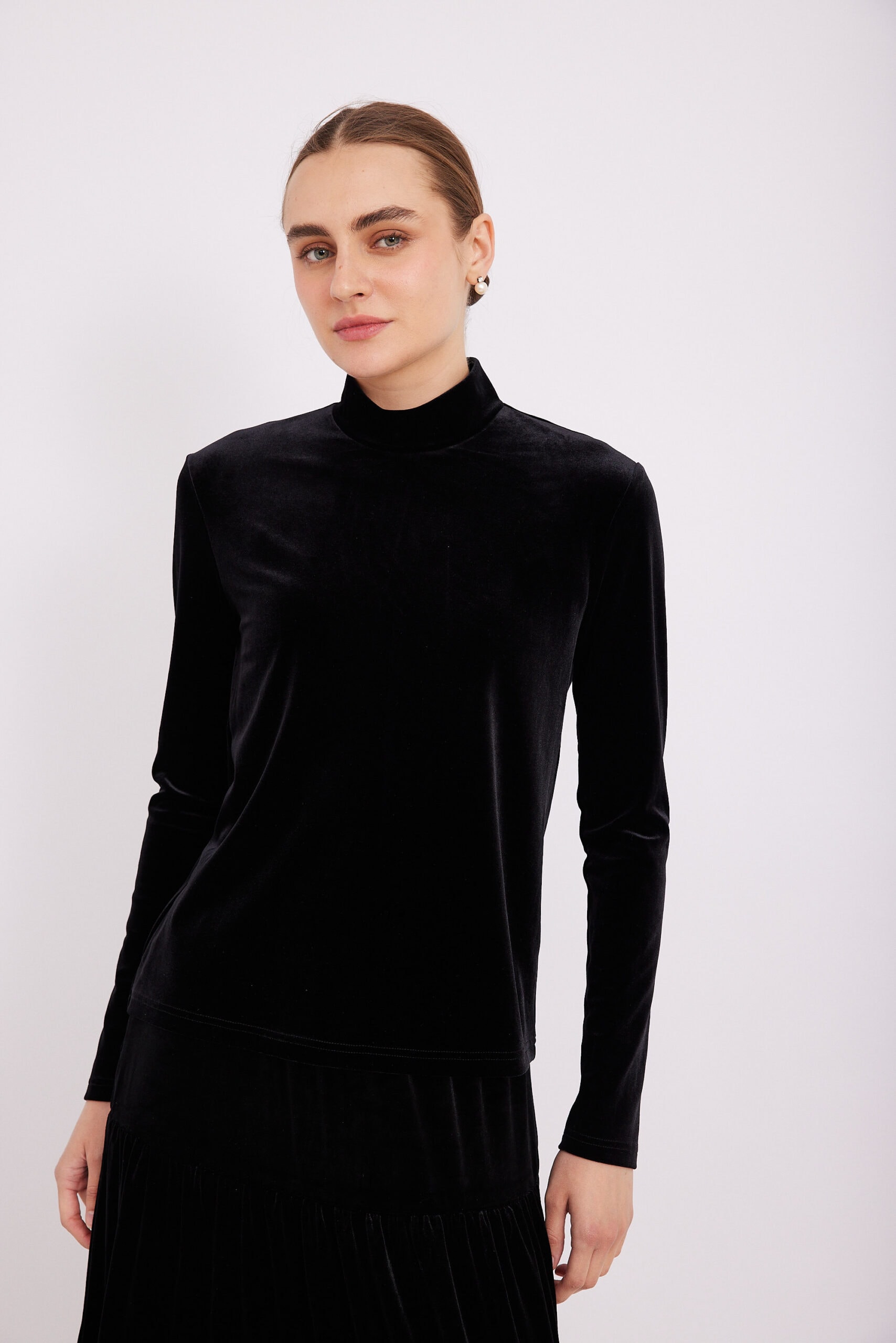 חולצת קטיפה שחורה קלאסית עם צווארון גבוה וגזרה ישרה ונעימה לגוף.