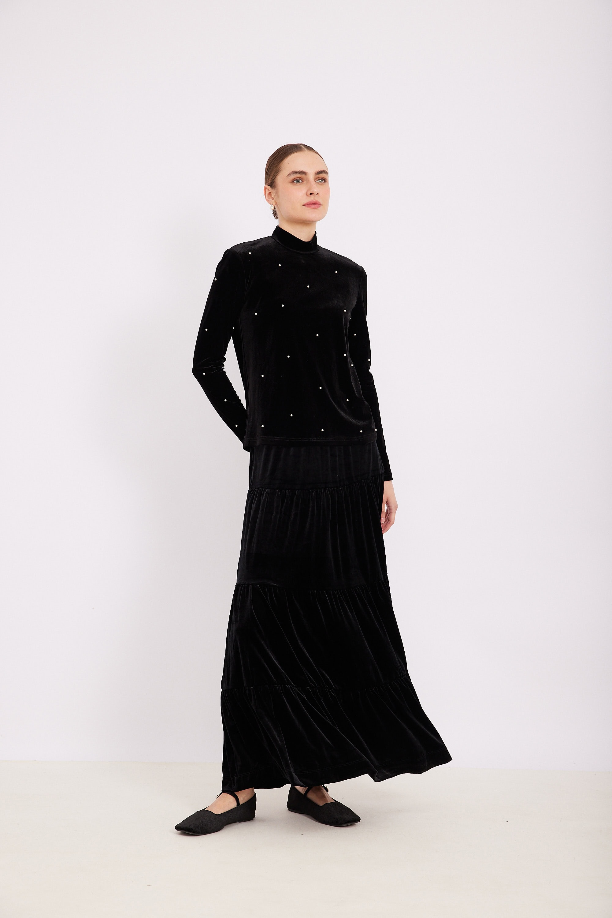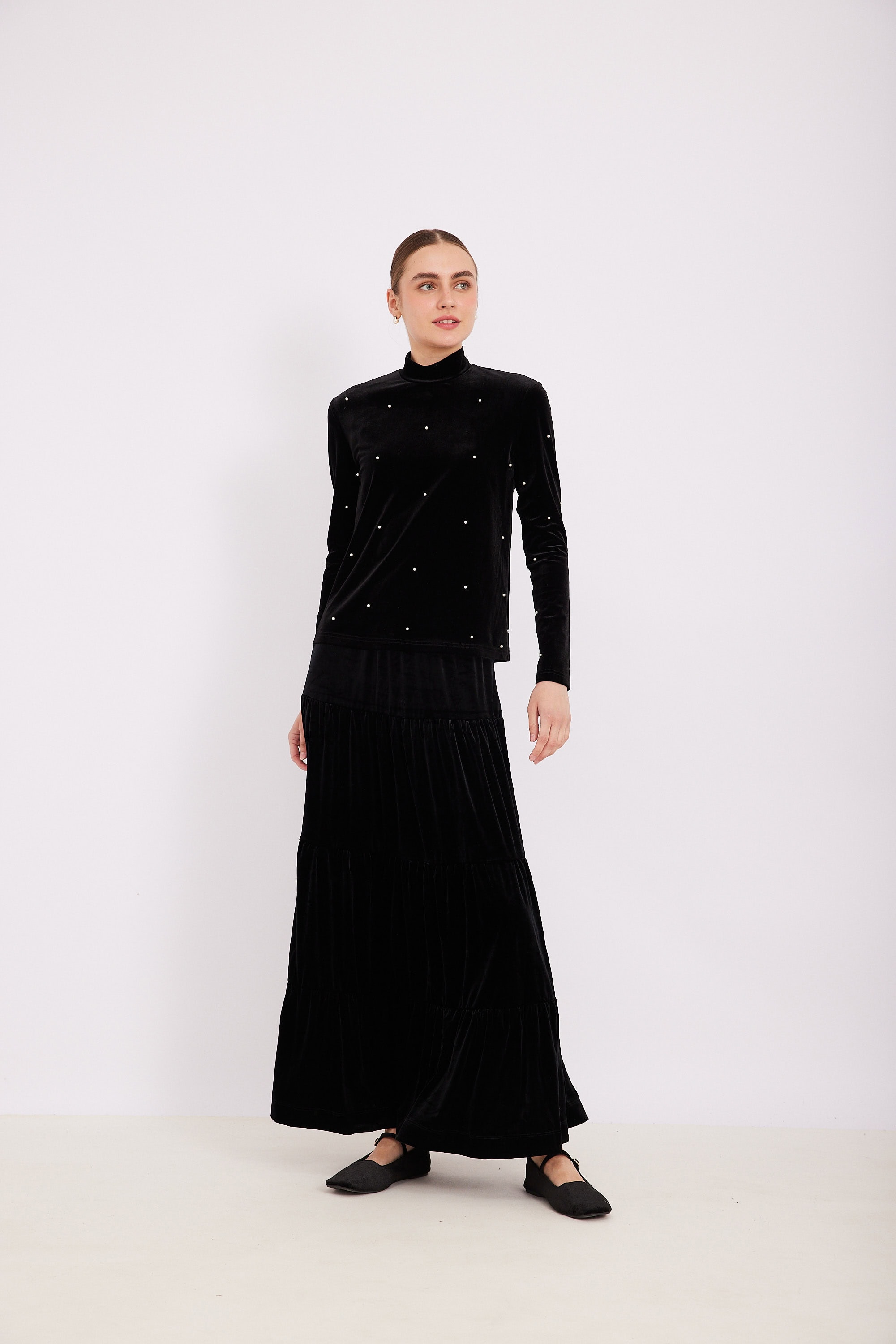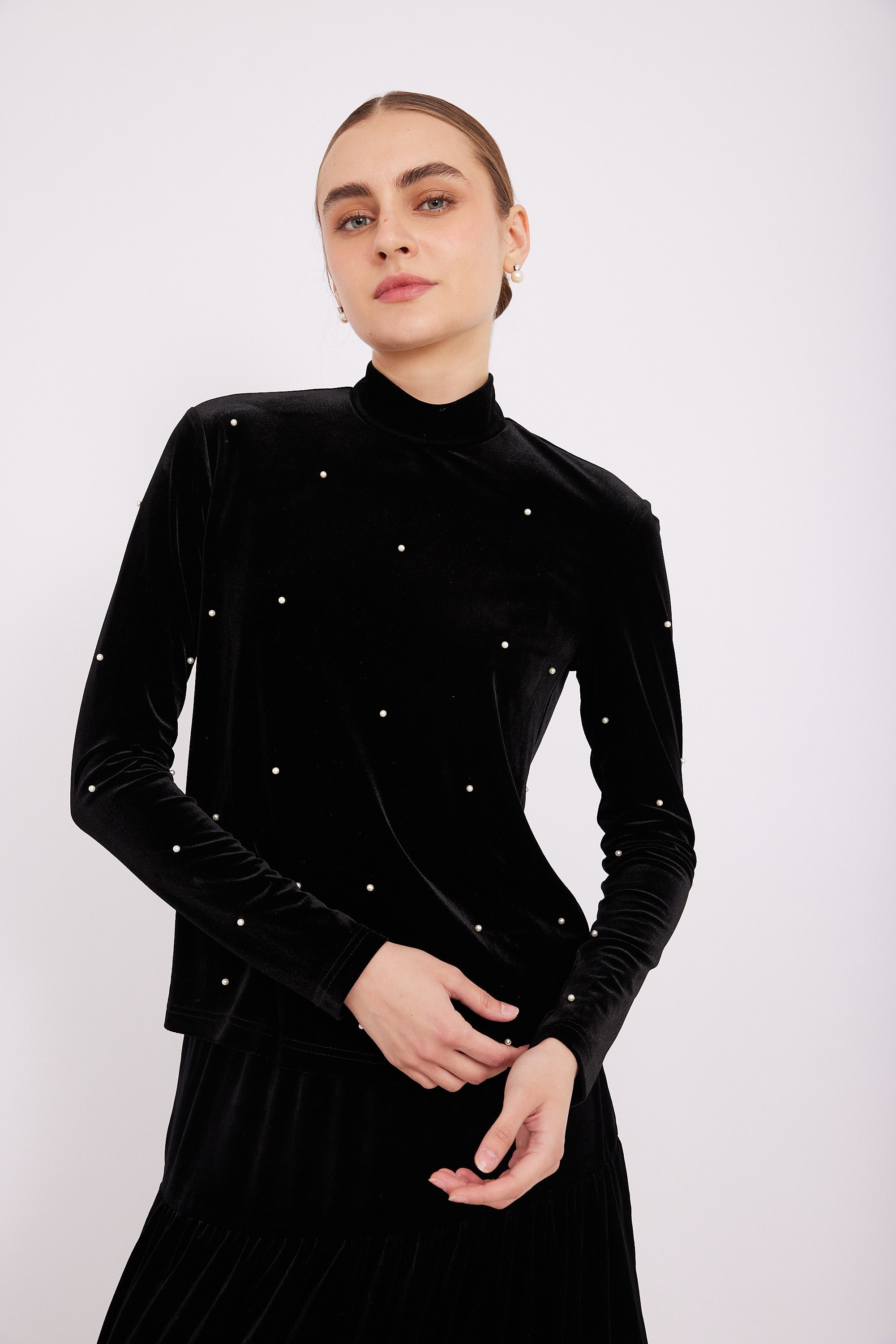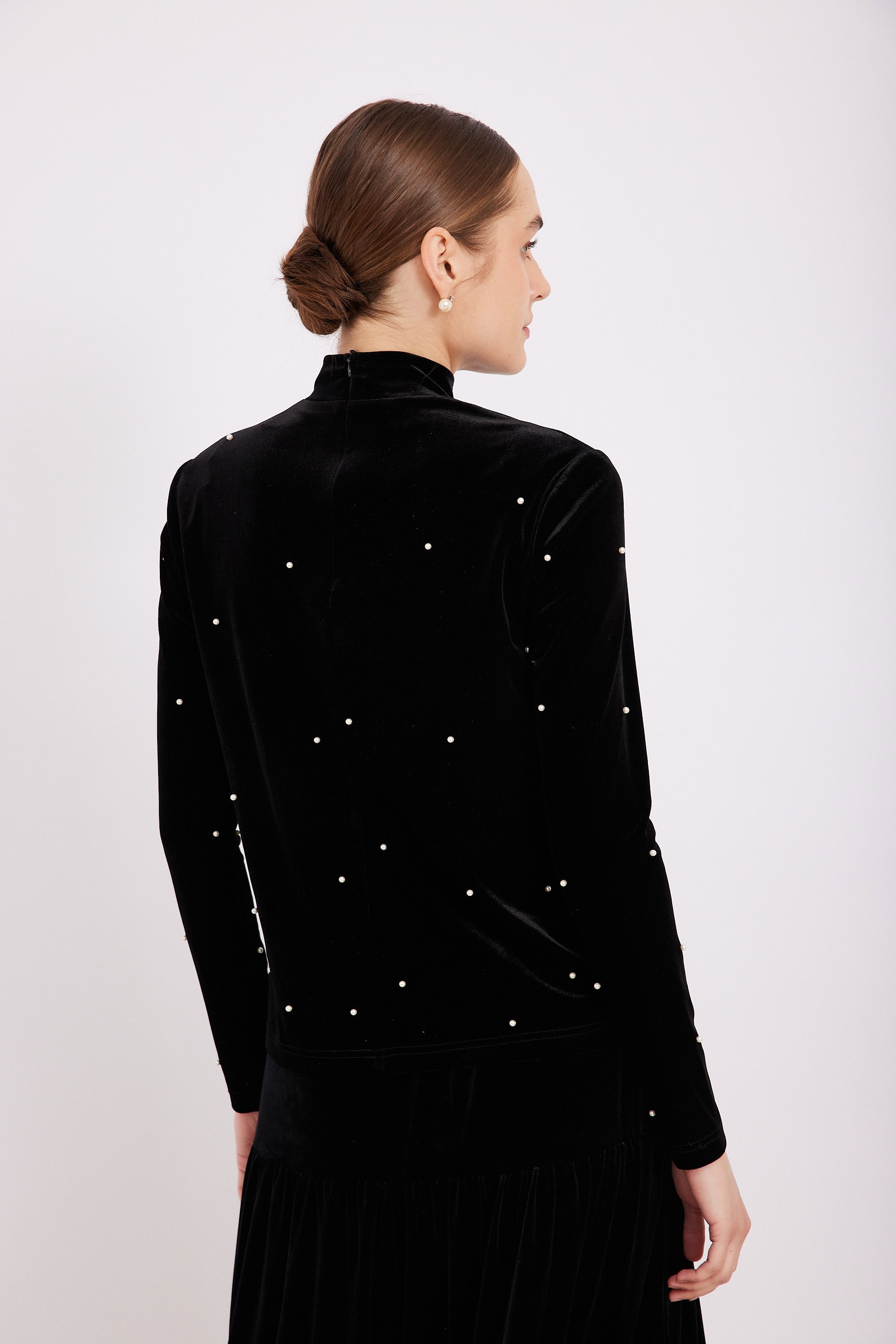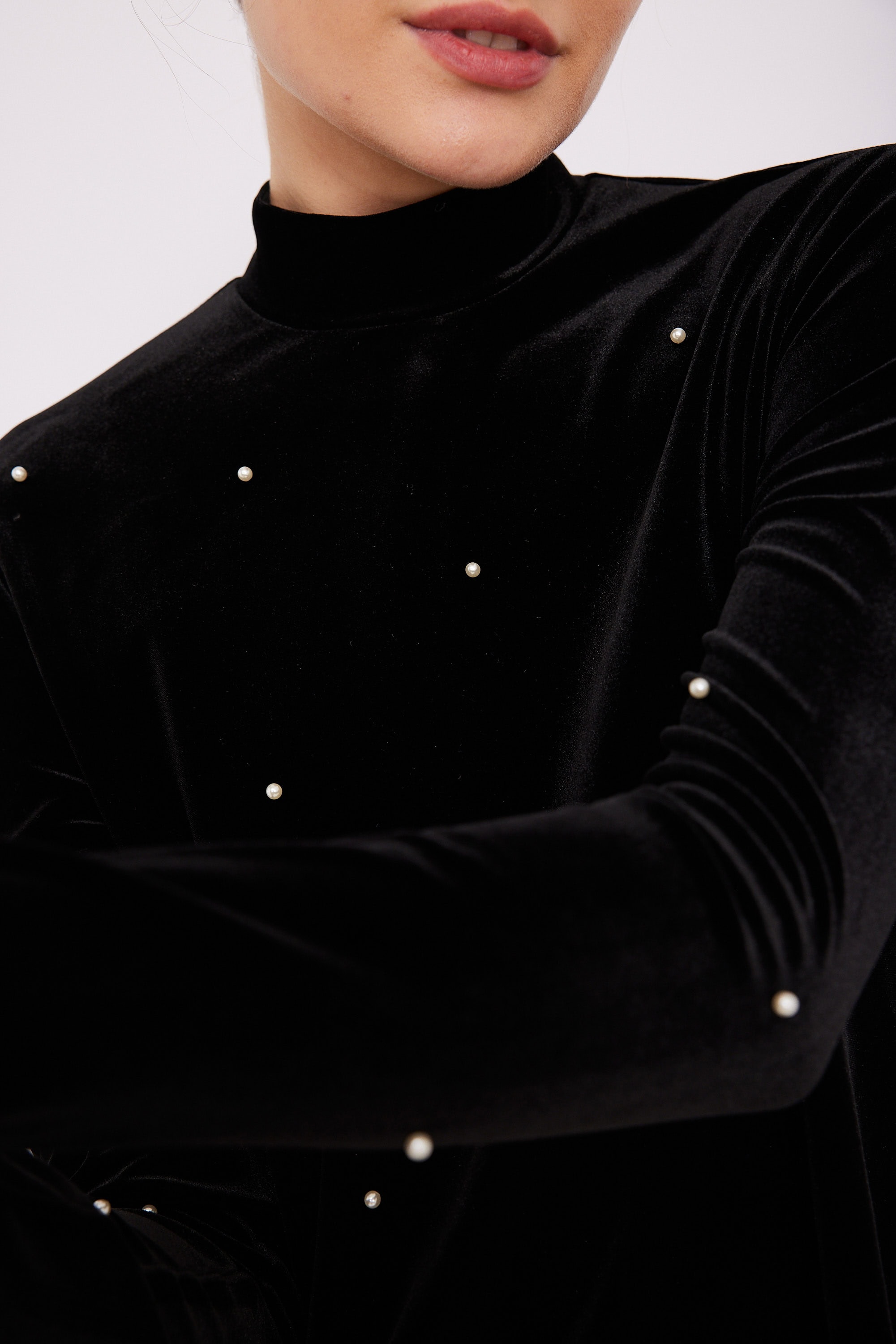 עיטורי פנינים עדינים הפזורים בעדינות על הבד. מעניקה מראה אלגנטי ומעודן,