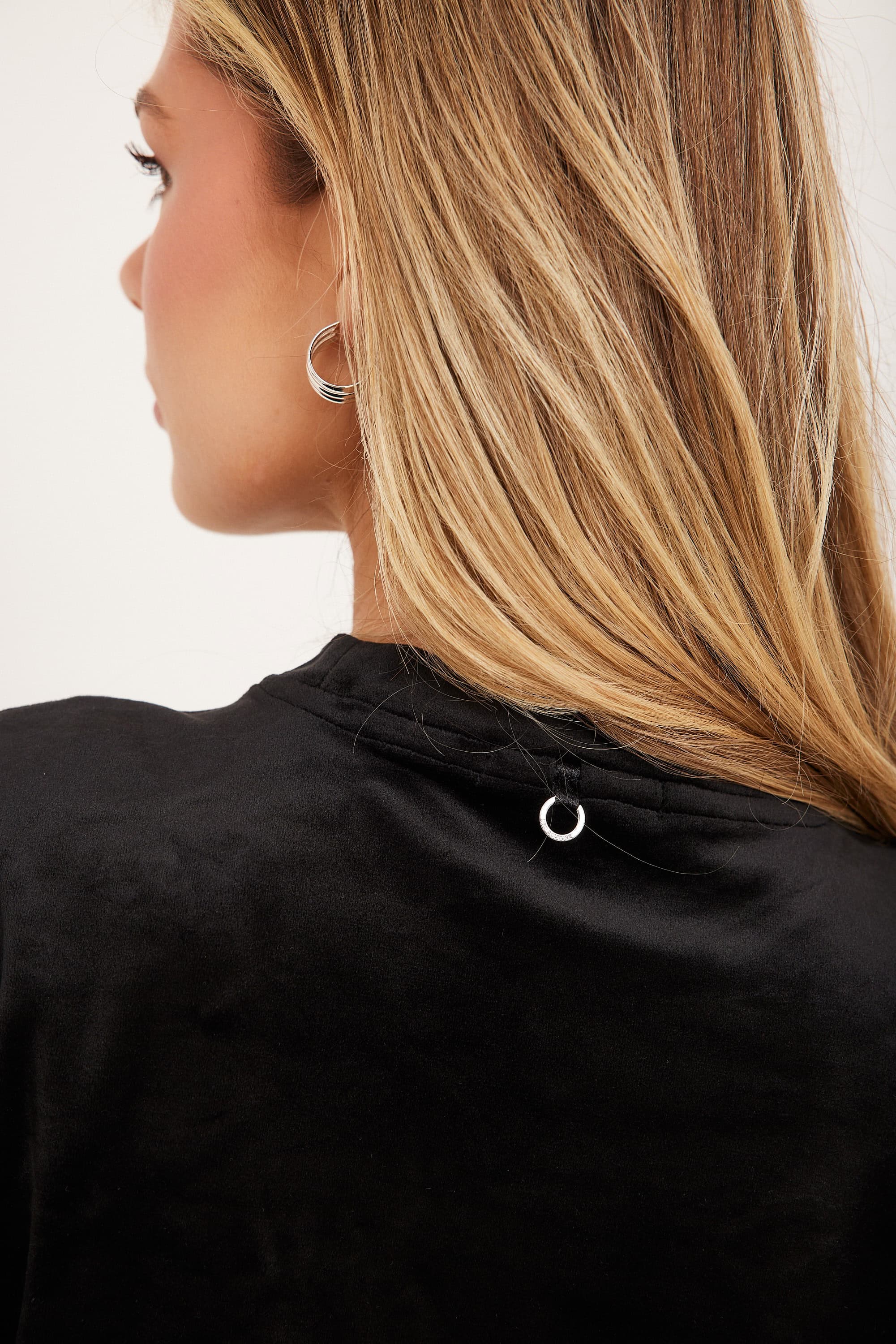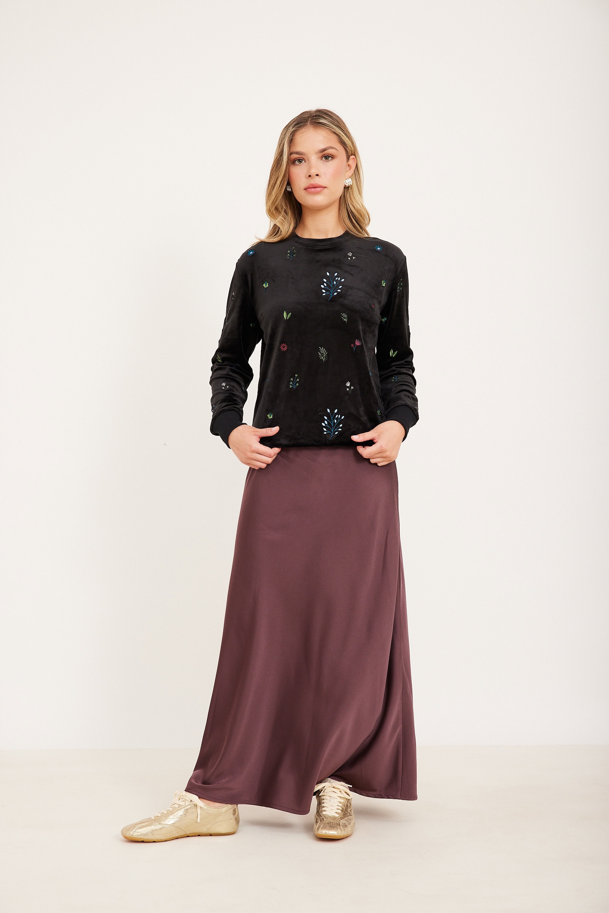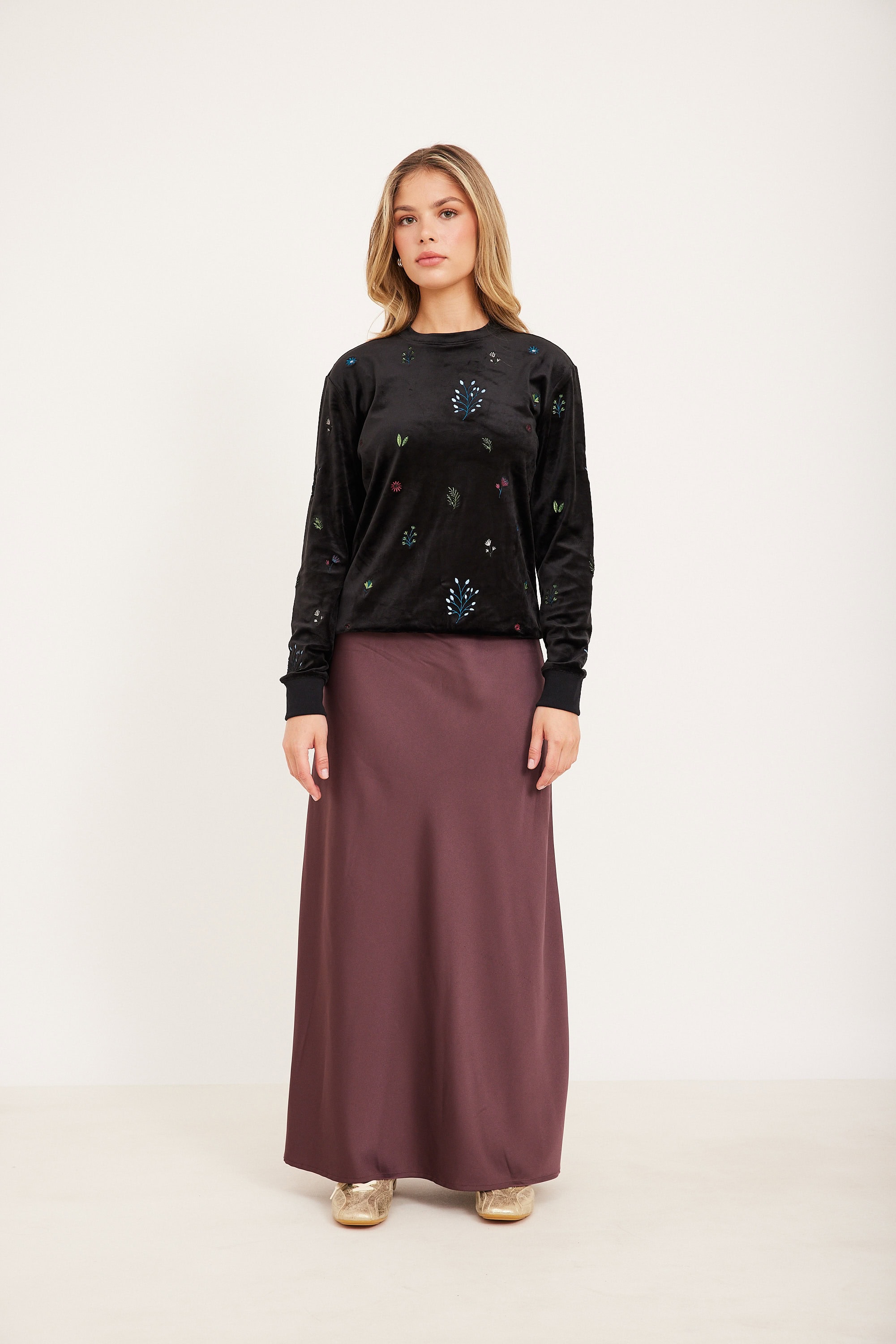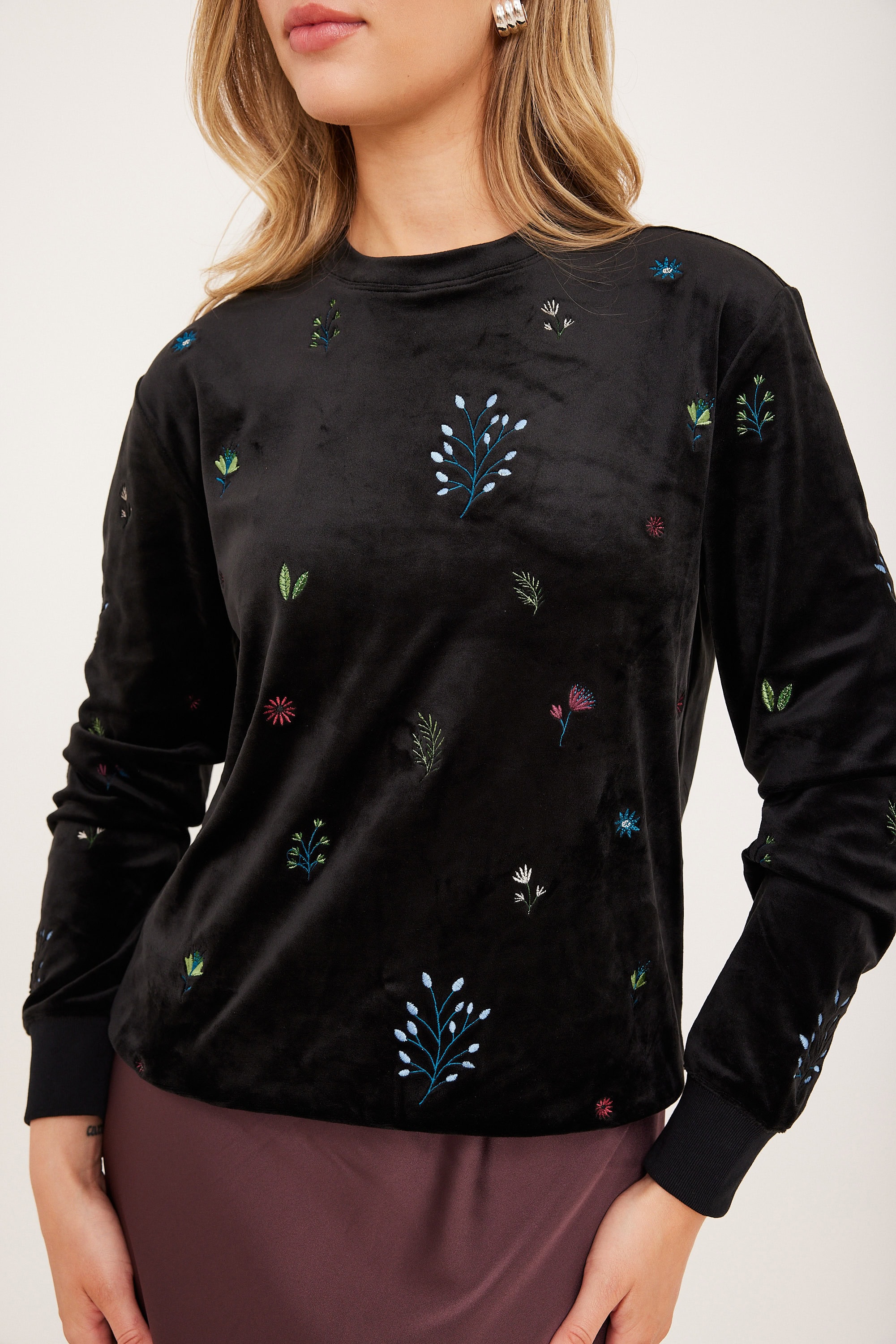 חולצת קטיפה שחורה עם רקמות פרחים צבעוניות.
