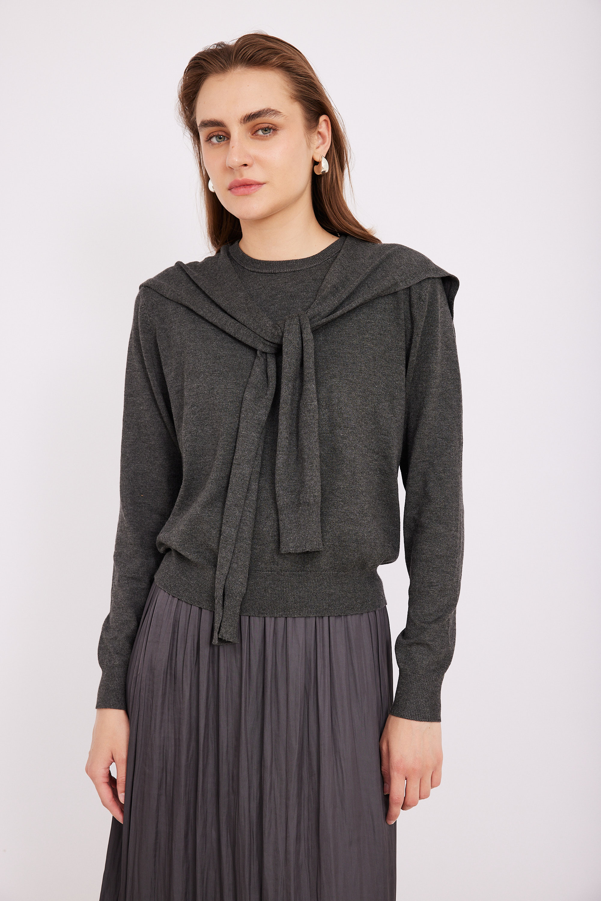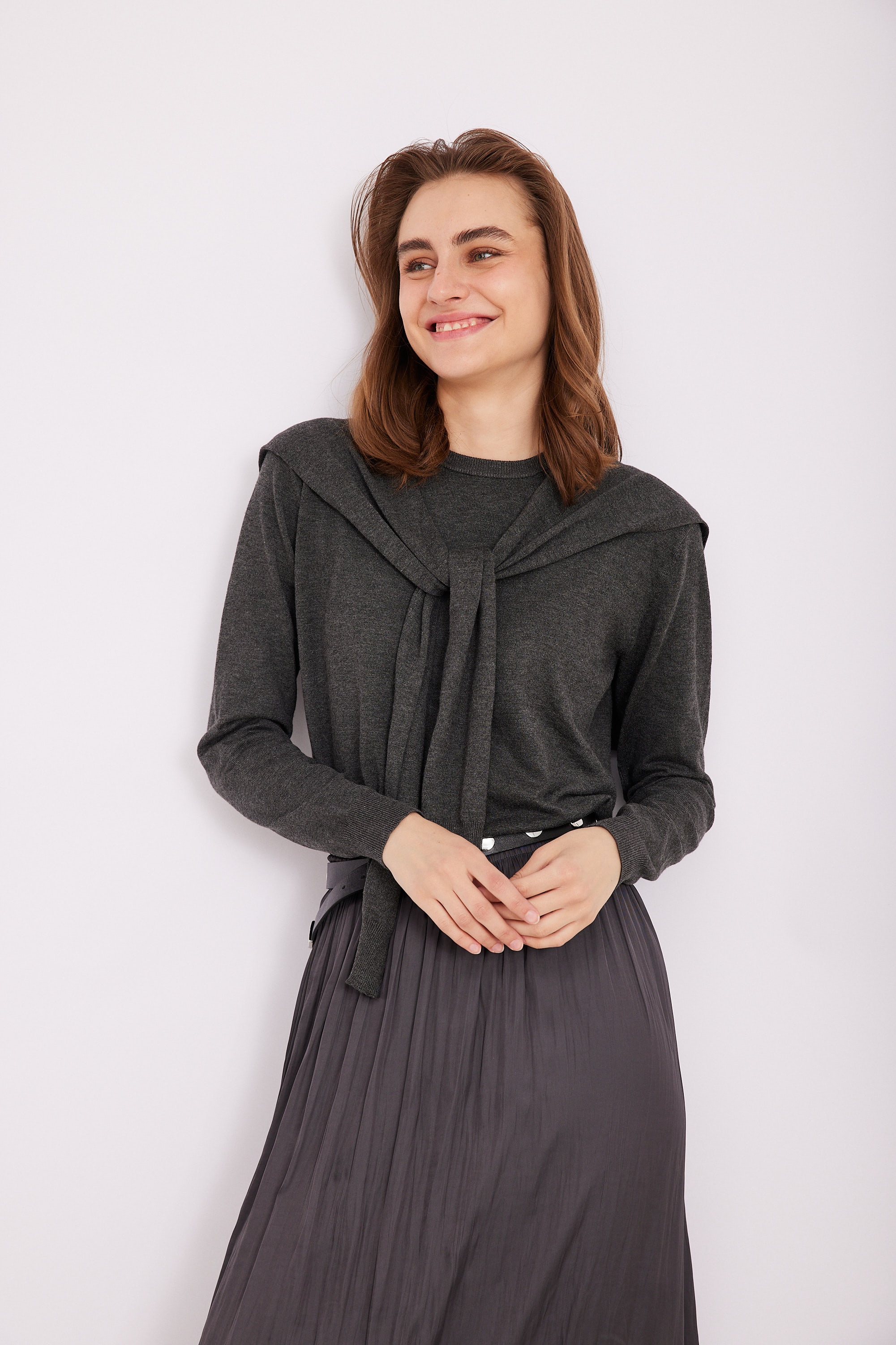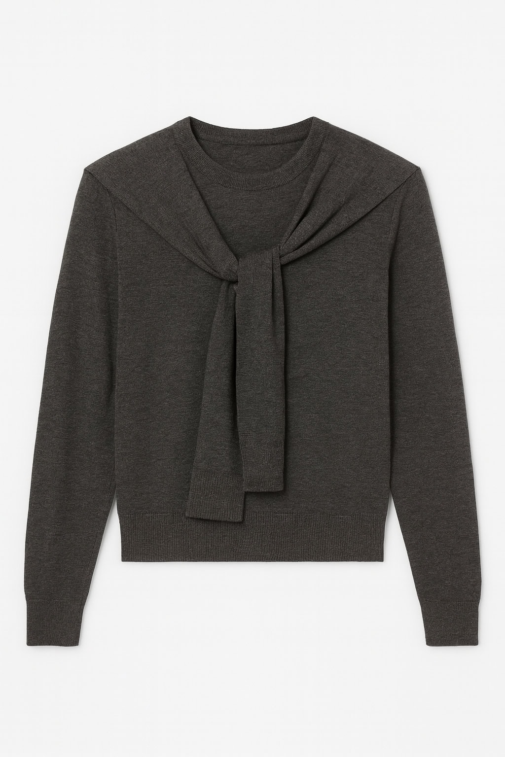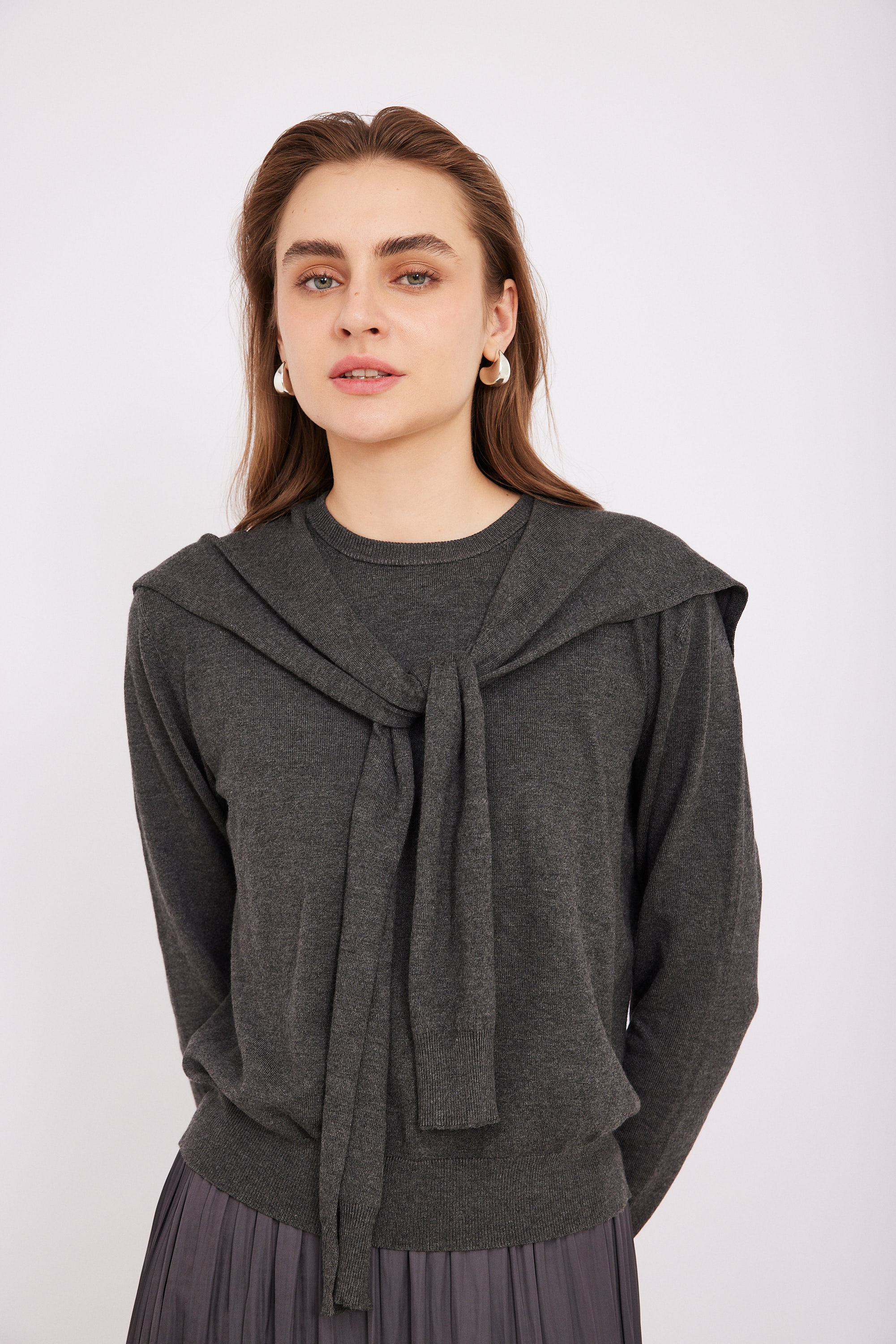 סריג אפור נעים ומחמם, בעל מגע רך וגזרה מודרנית. הסריג מגיע עם קשירה מיוחדת בקצוות, המדמה מראה של חולצה נוספת הקשורה סביב הכתפיים– פריט טרנדי המוסיף סטייל לכל הופעה