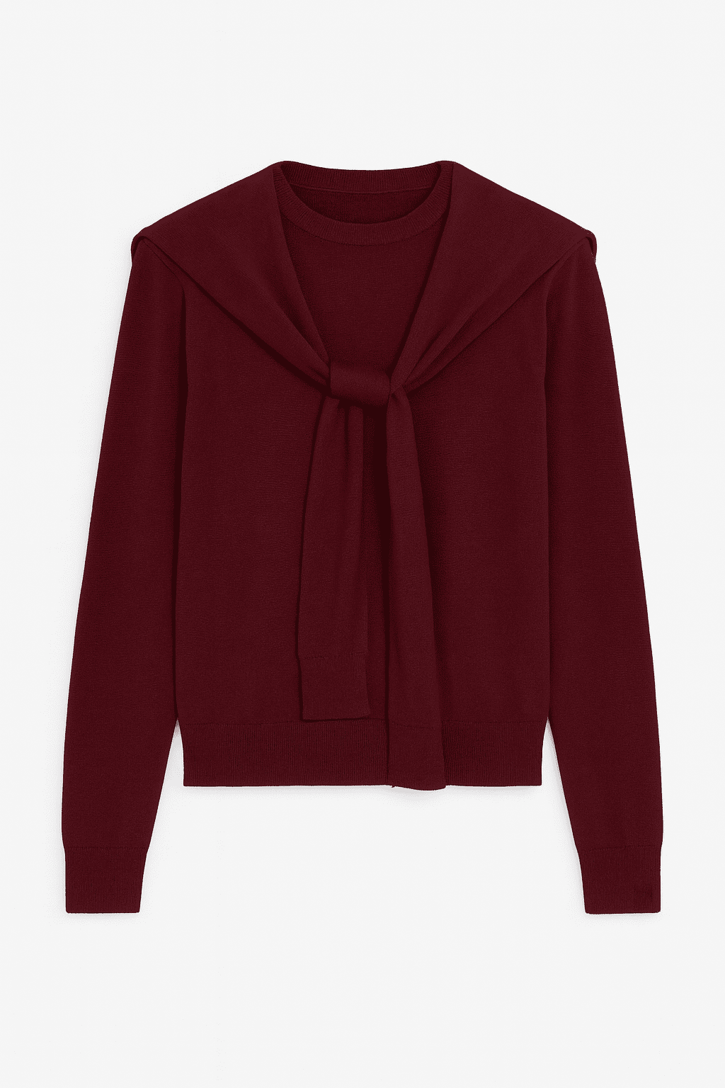 סריג בורדו נעים ומחמם, בעל מגע רך וגזרה מודרנית. הסריג מגיע עם קשירה מיוחדת בקצוות, המדמה מראה של חולצה נוספת הקשורה סביב הכתפיים– פריט טרנדי המוסיף סטייל לכל הופעה