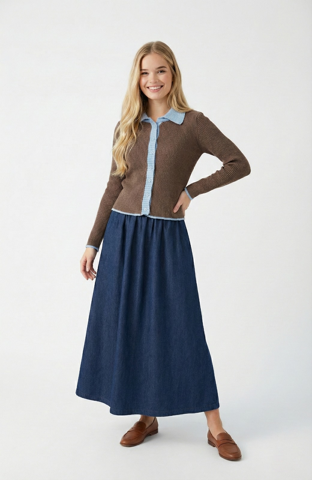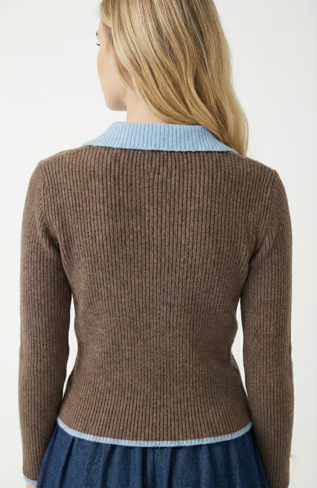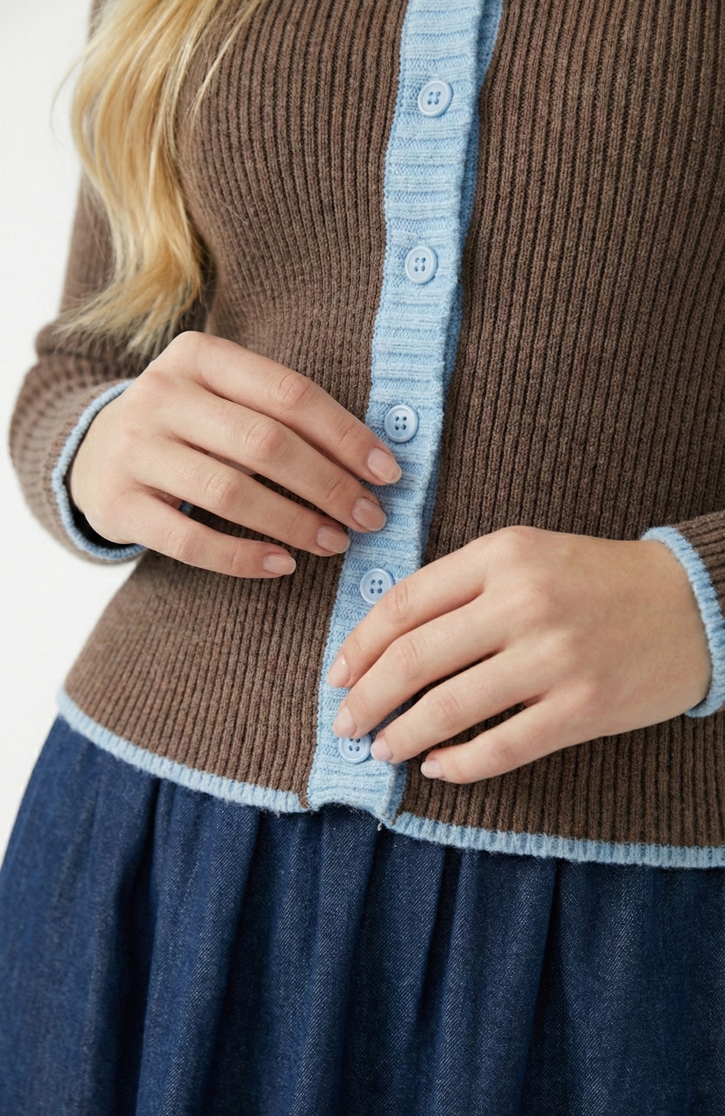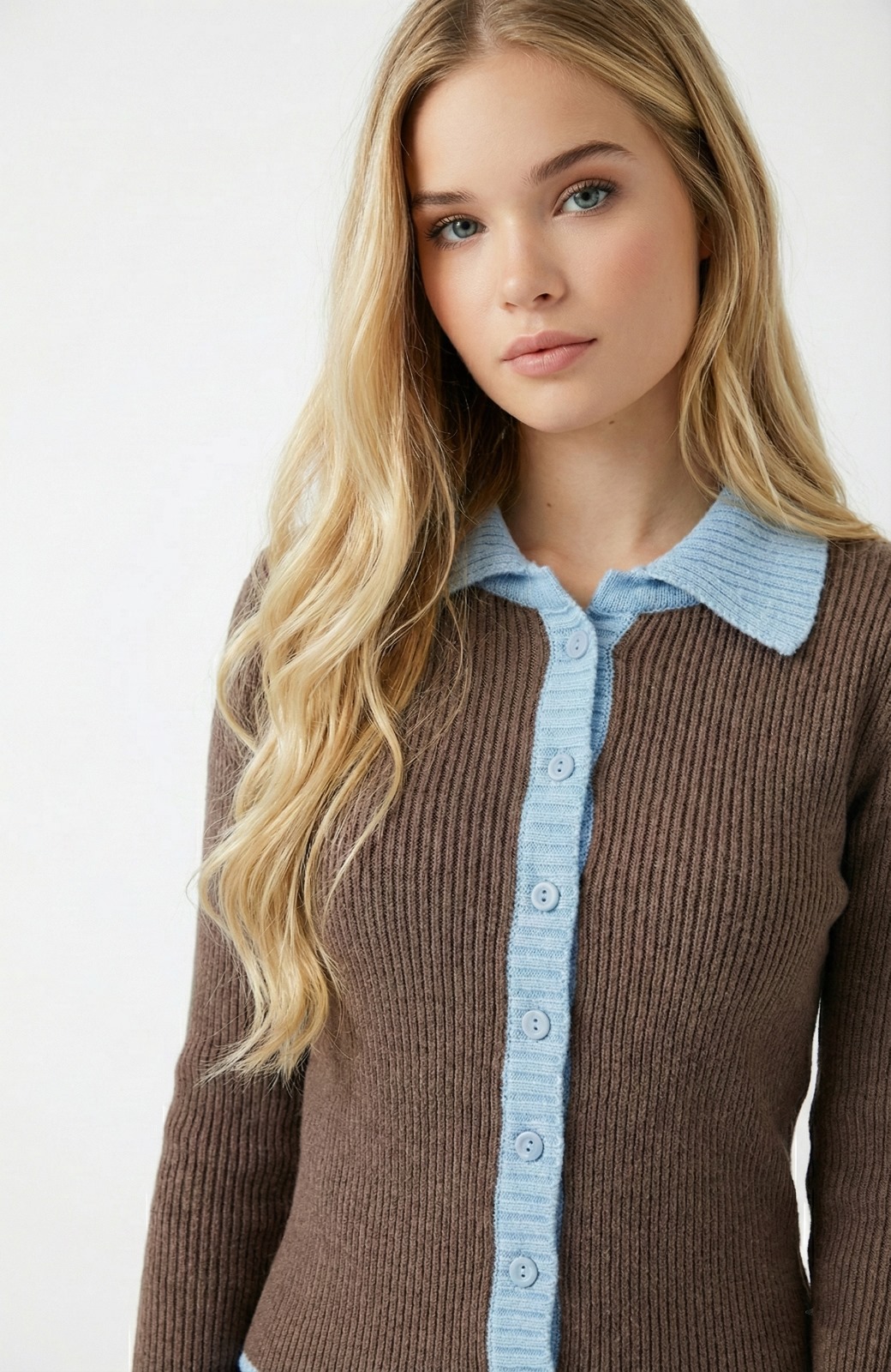 סריג מחמם ושיקי בגזרת קרדיגן צמודה, עם שילוב מהמם של חום ותכלת.