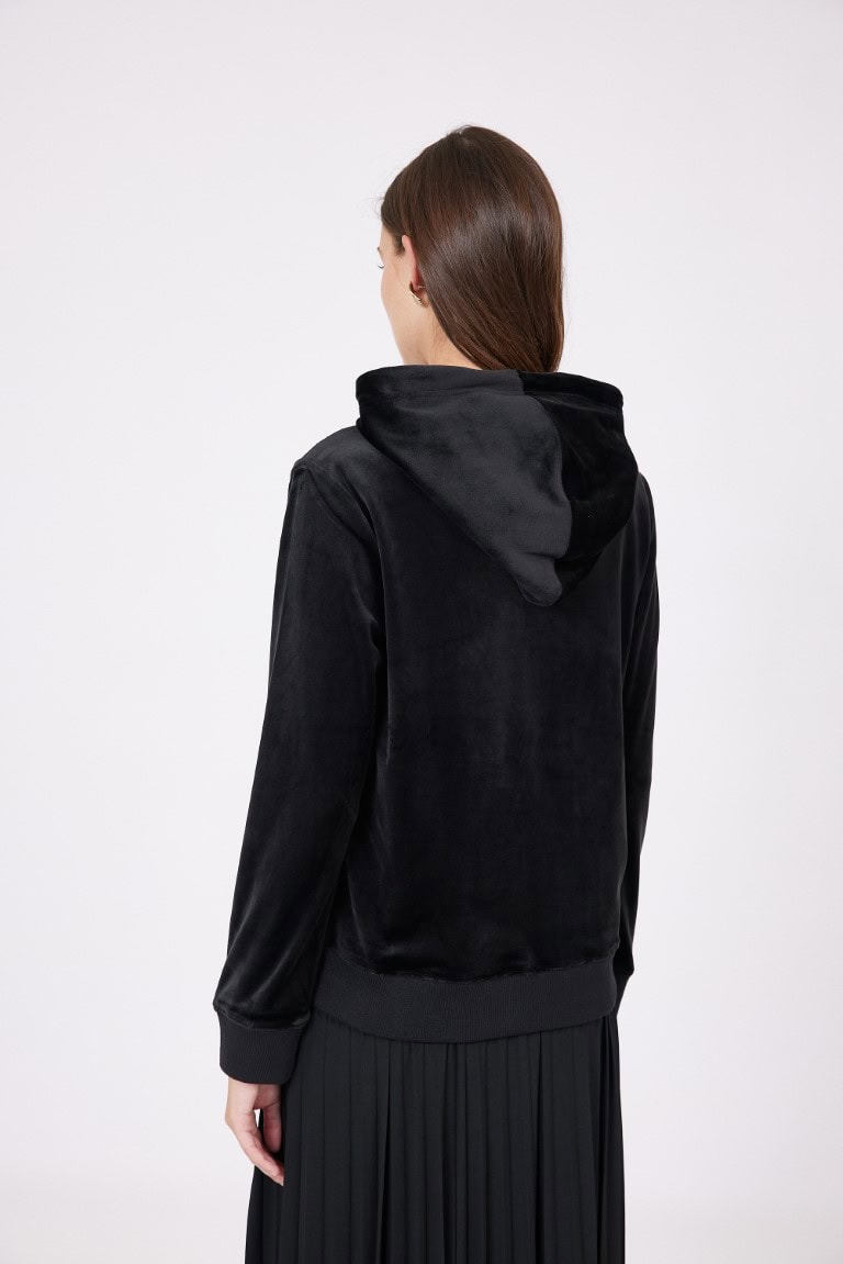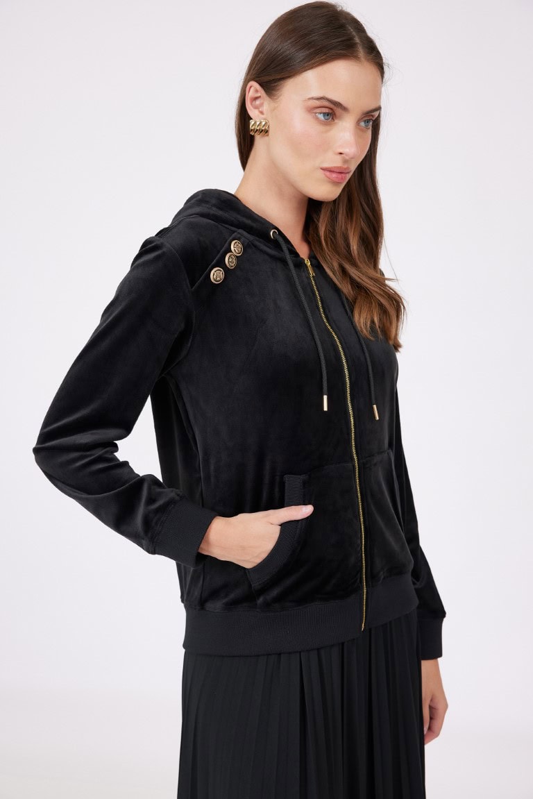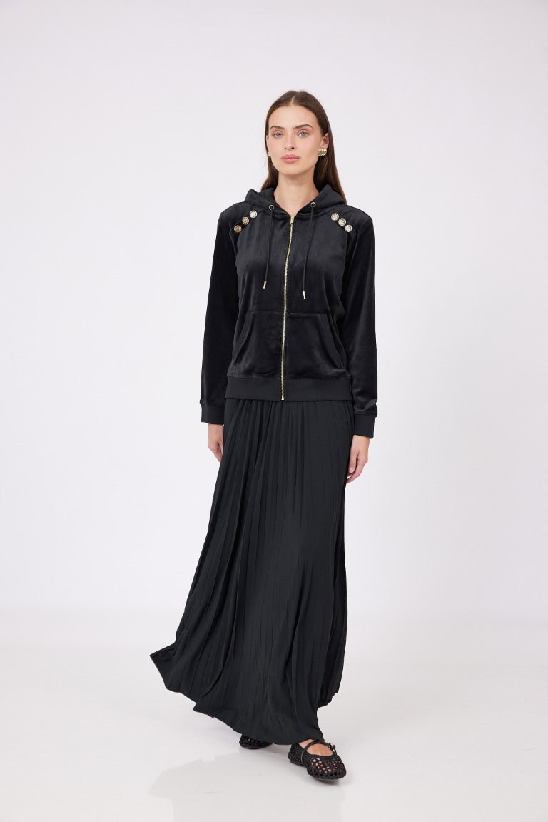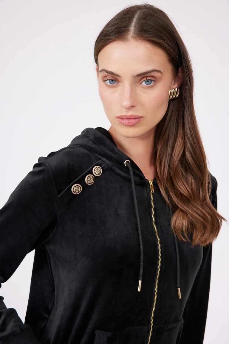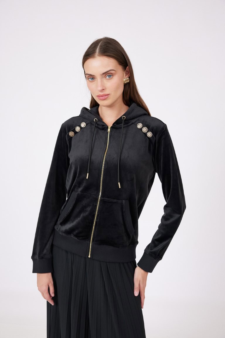 קפוצ’ון קטיפה שחור עם רוכסן זהב וכפתורים דקורטיביים על הכתפיים.