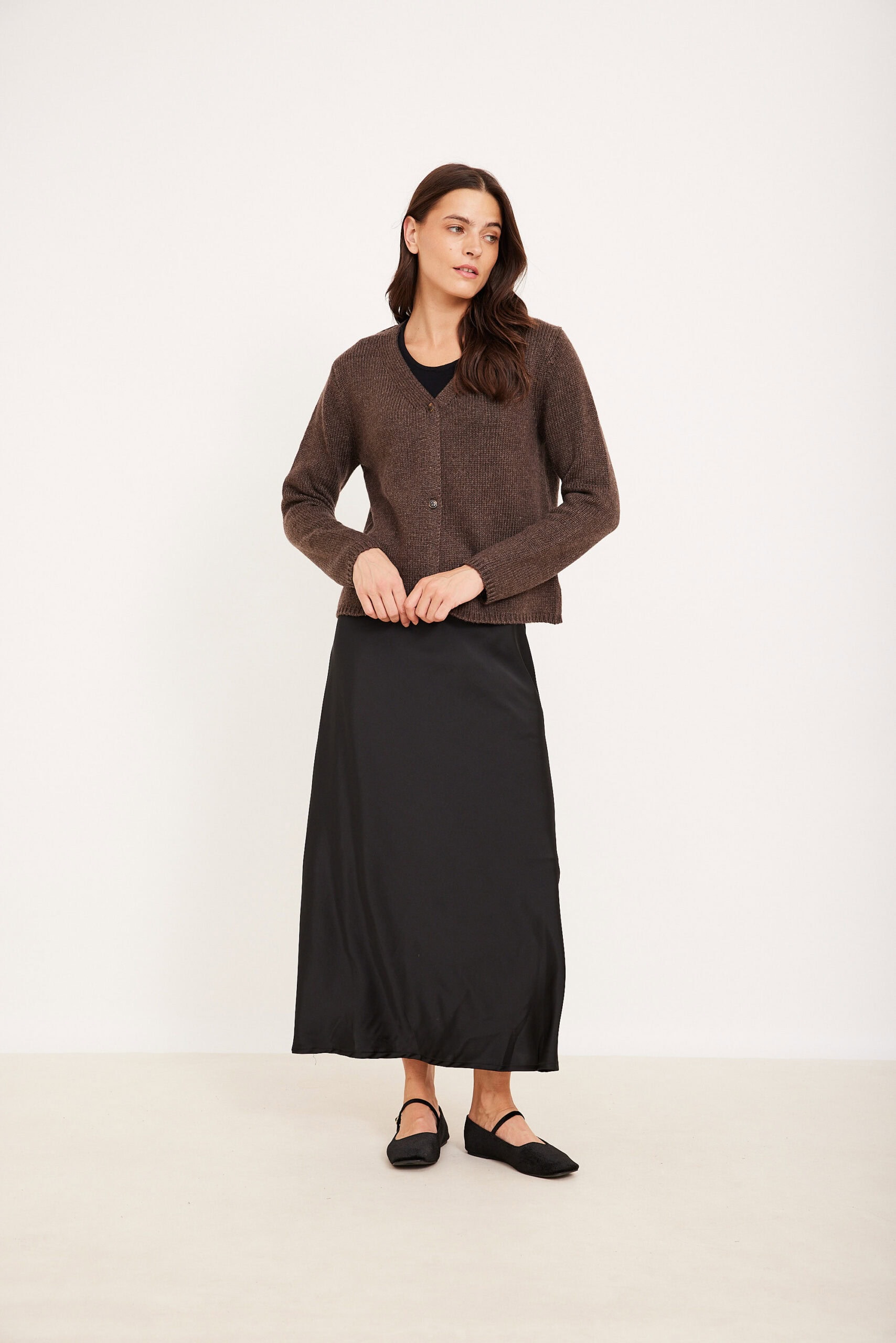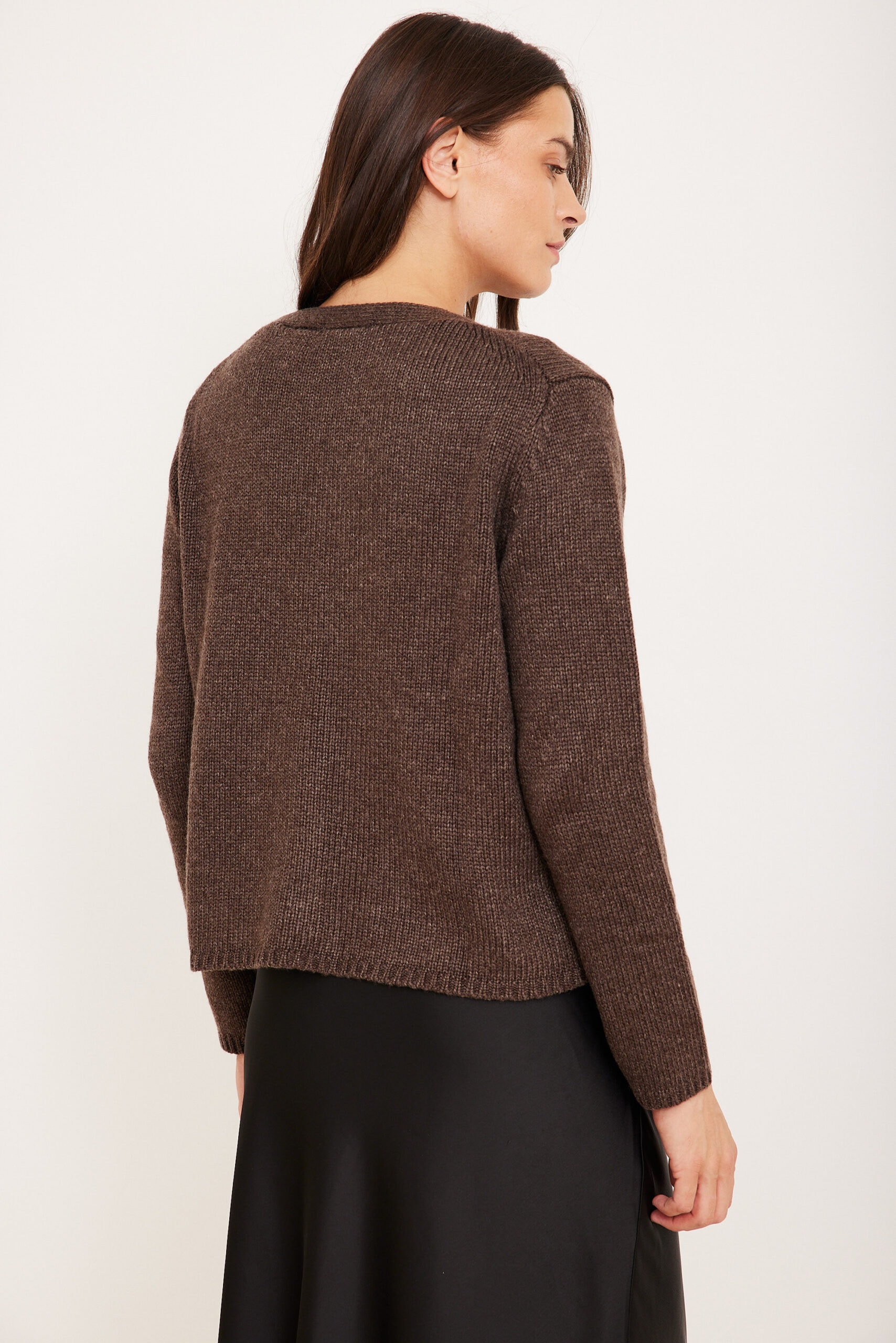 סריג עליון בגזרת קרדיגן קלאסית בצבע חום עמוק, עם שני כפתורים ומרקם רך ונעים.