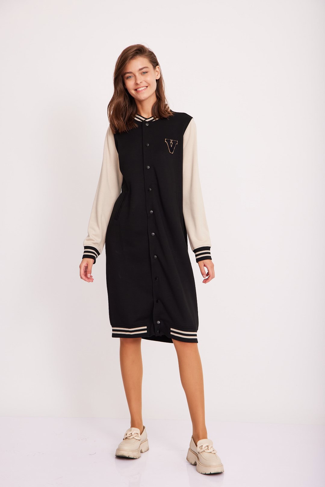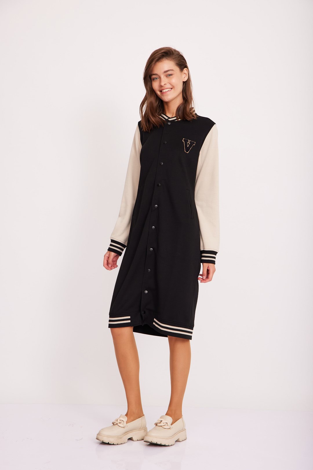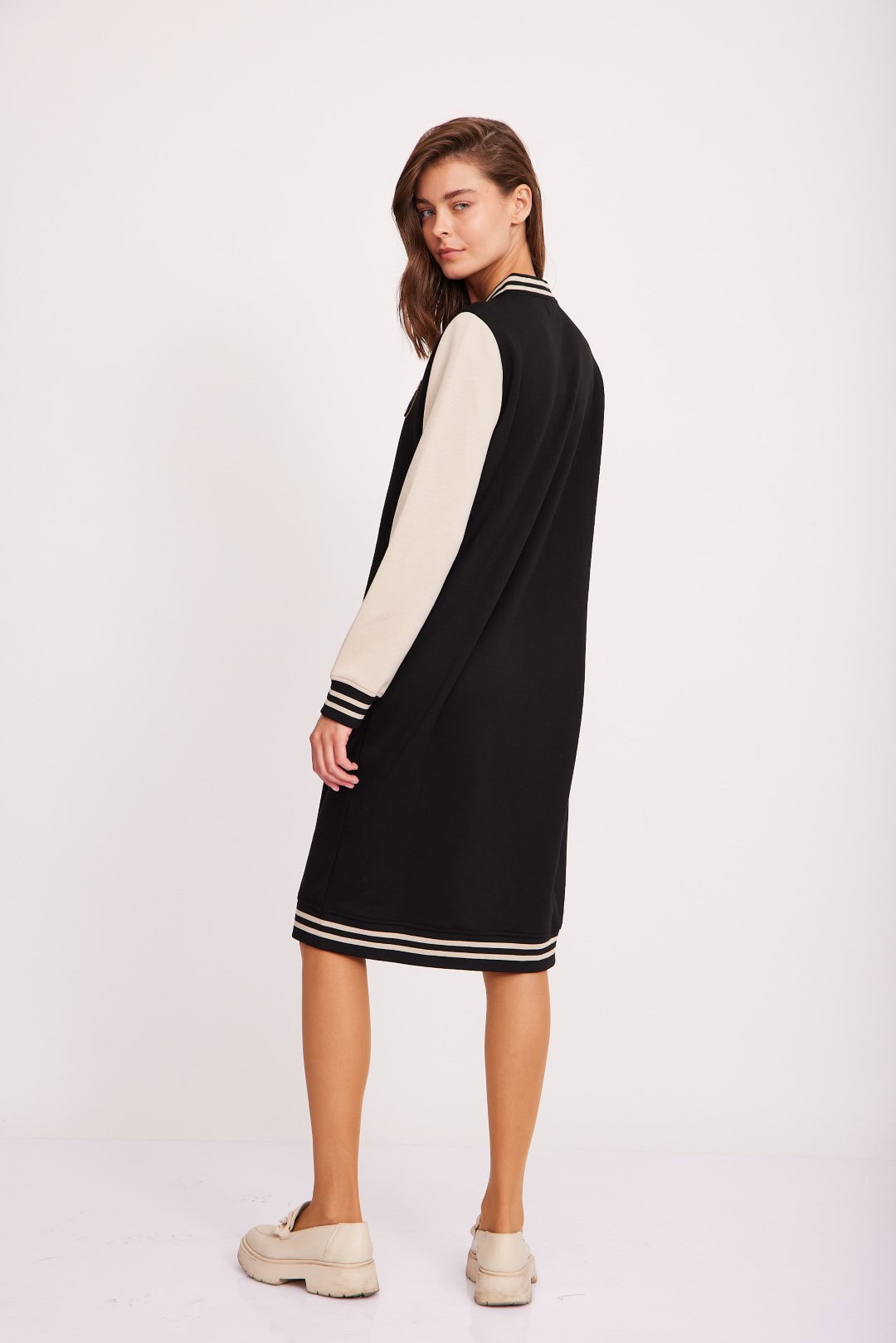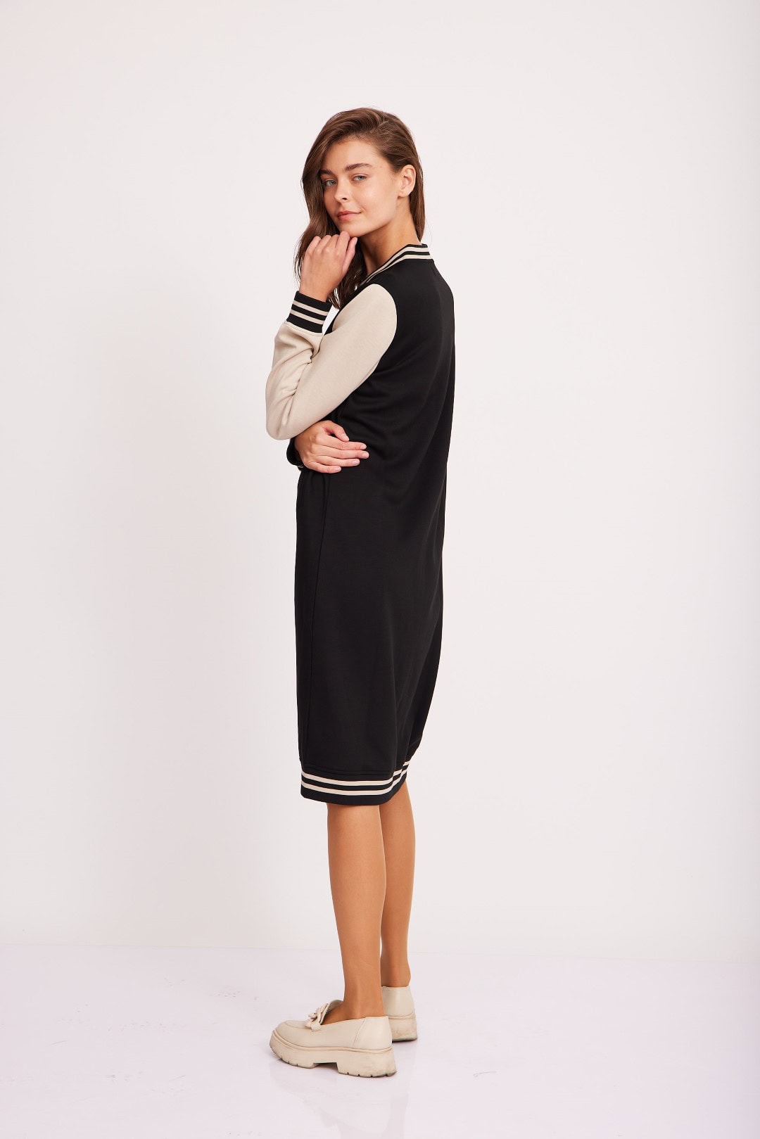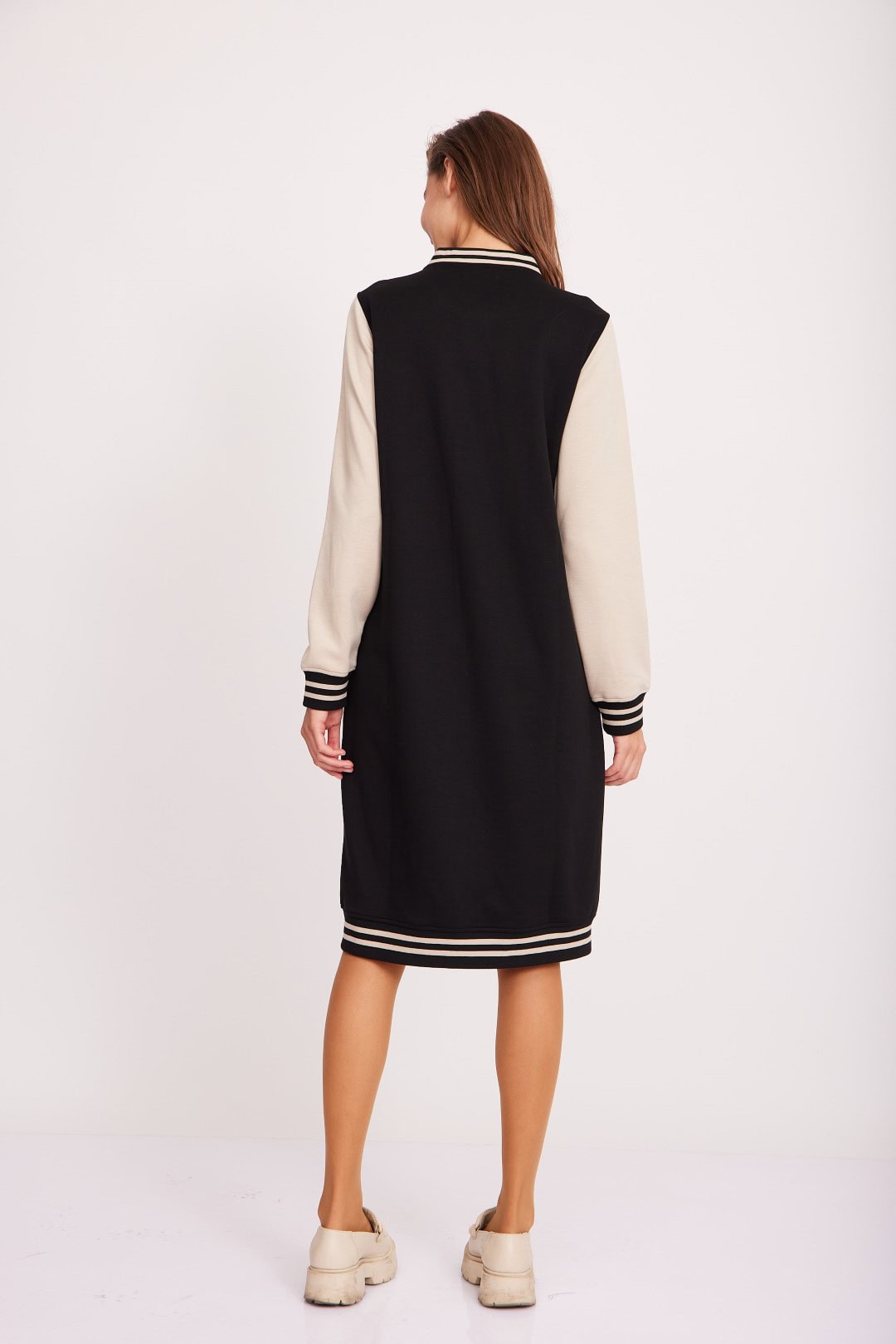 שמלת כפתורים שחורה עם שרוולים בצבע קאמל