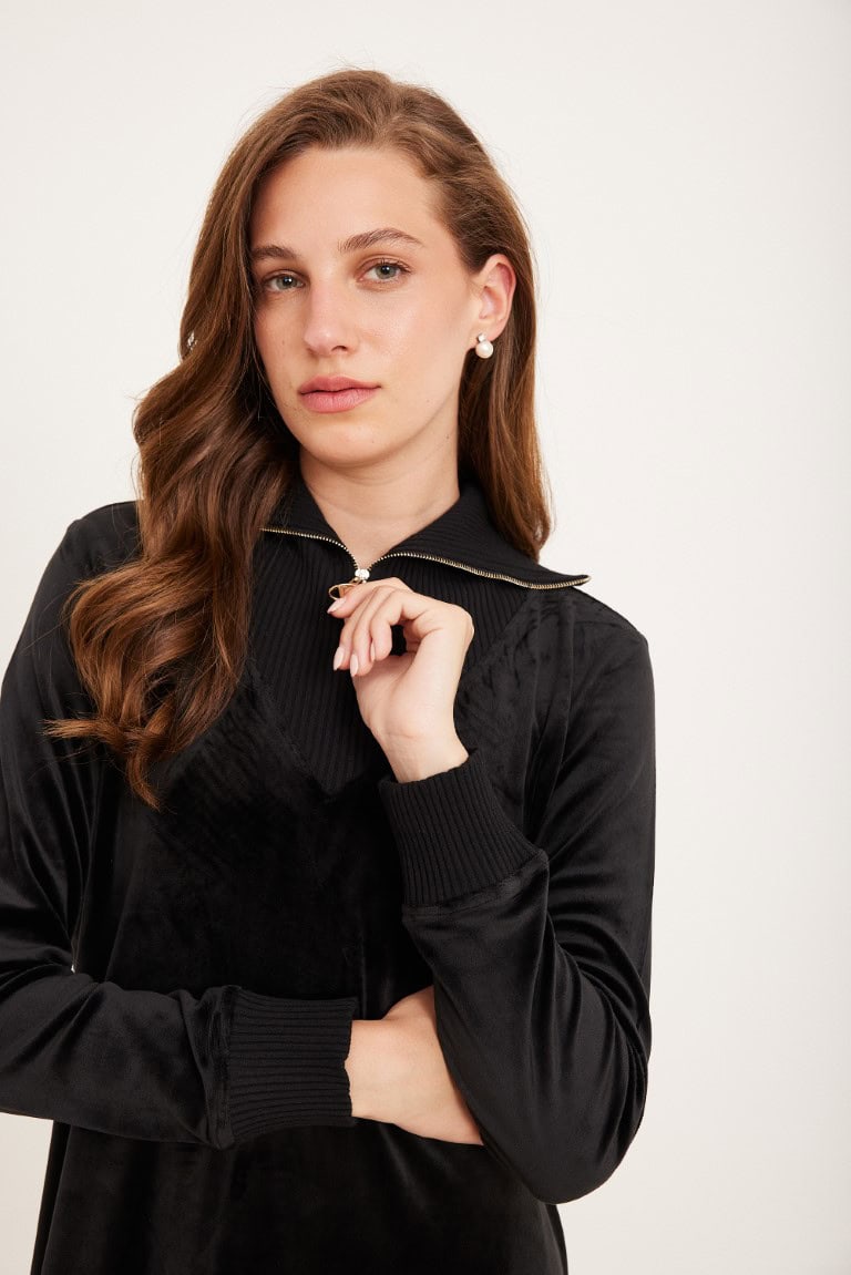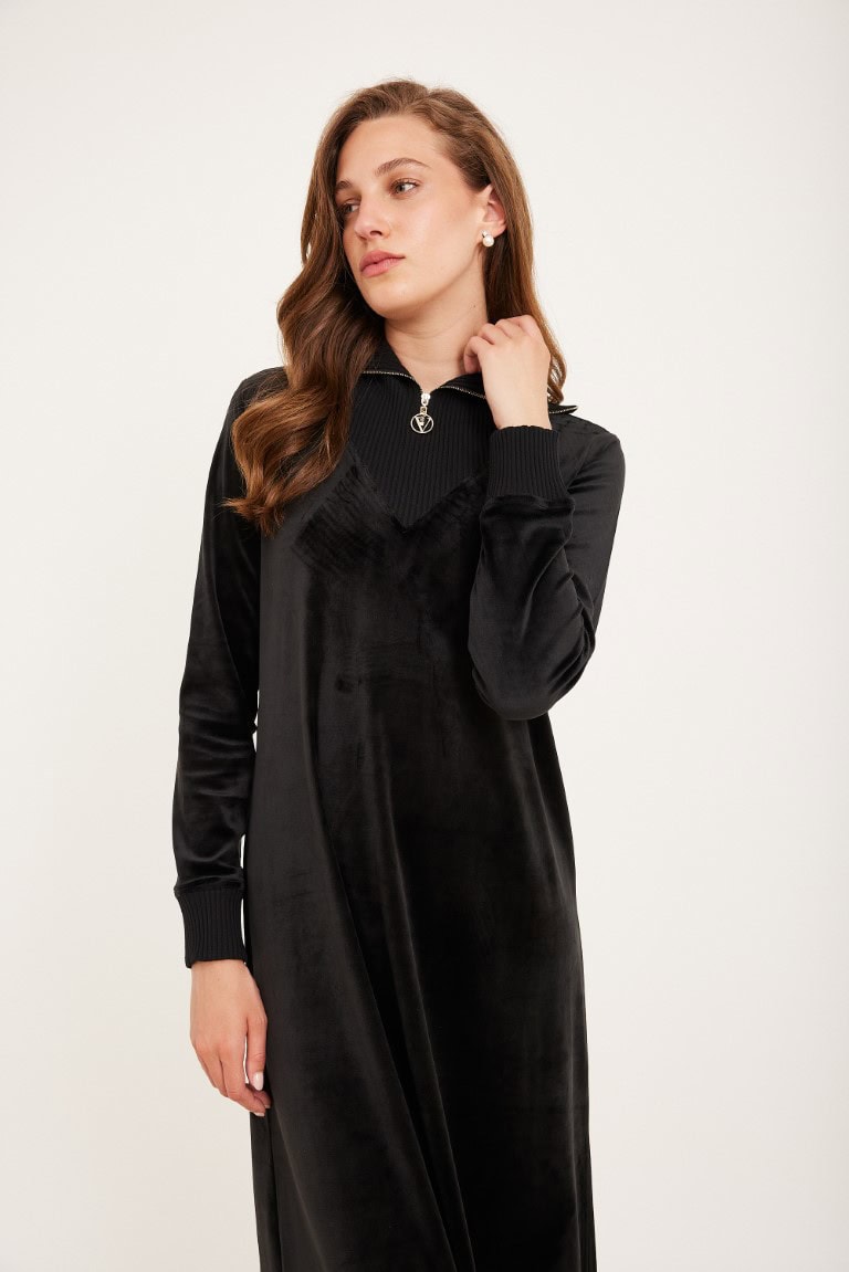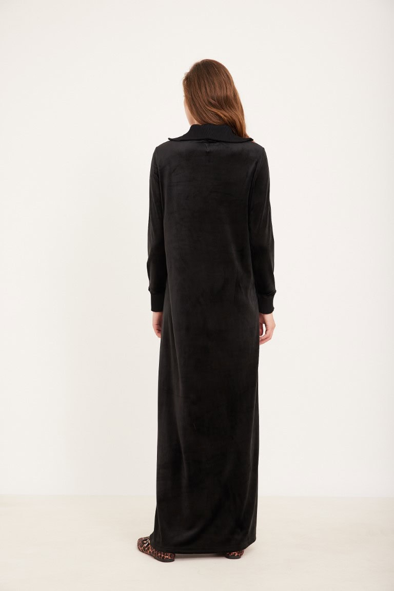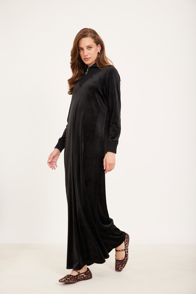 שמלת קטיפה שחורה ארוכה עם צווארון ריבס ורוכסן זהב קדמי
