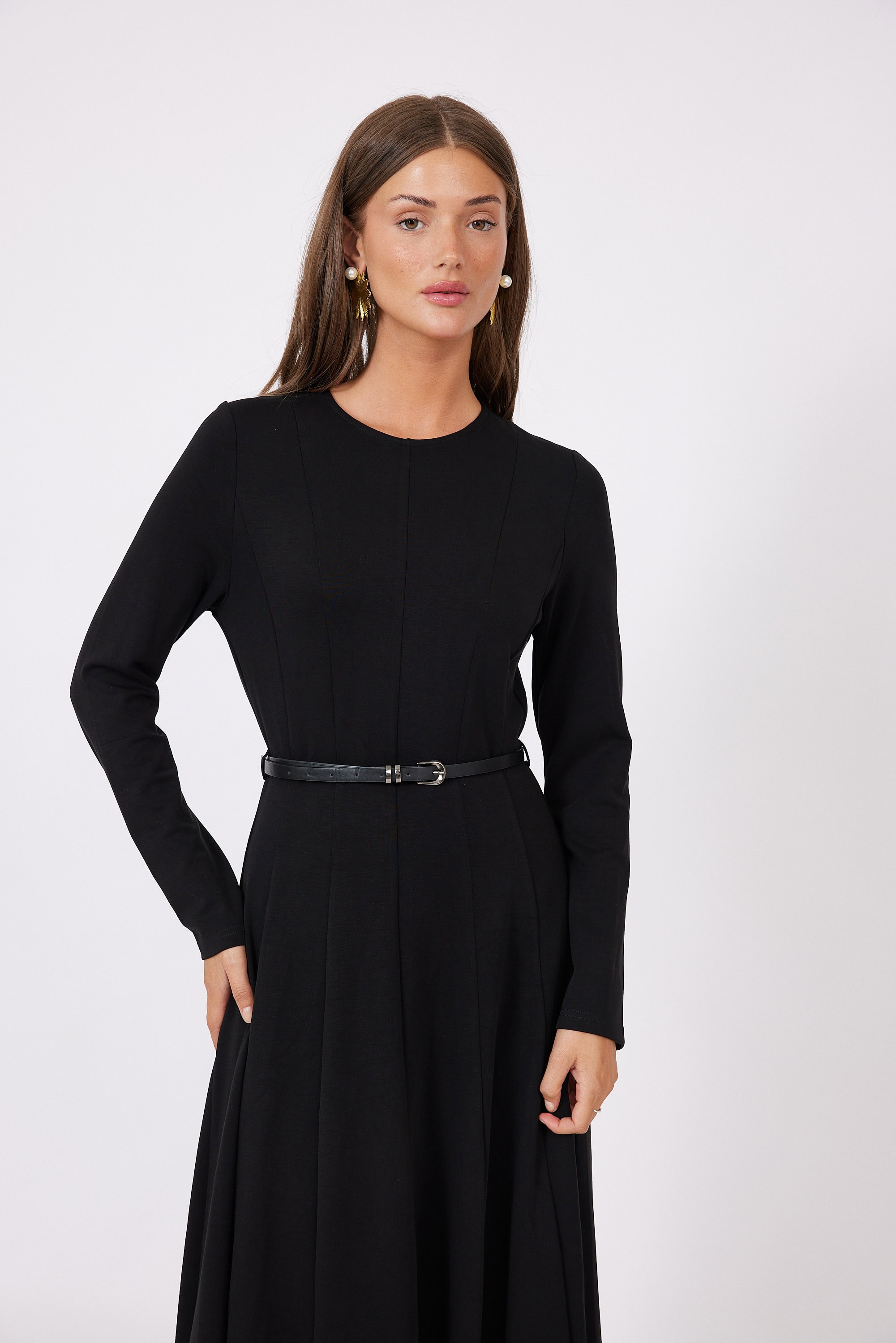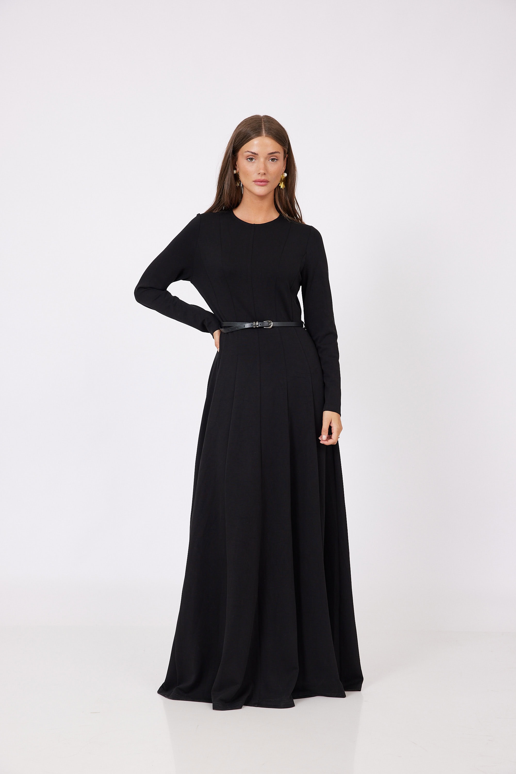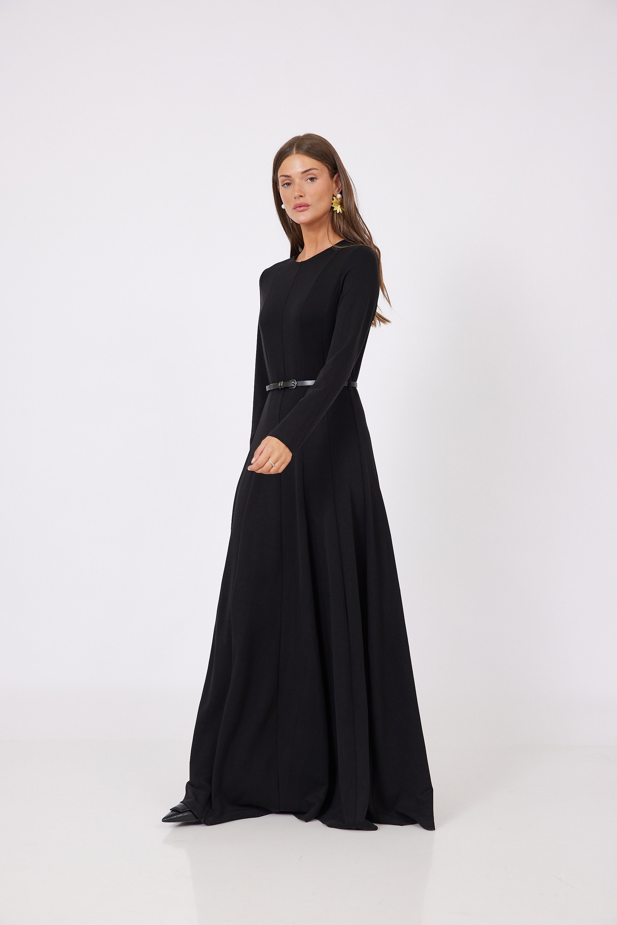 שמלת מקסי שחורה קלאסית בגזרת פרנסס חיתוכים נשפכת ומחמיאה,