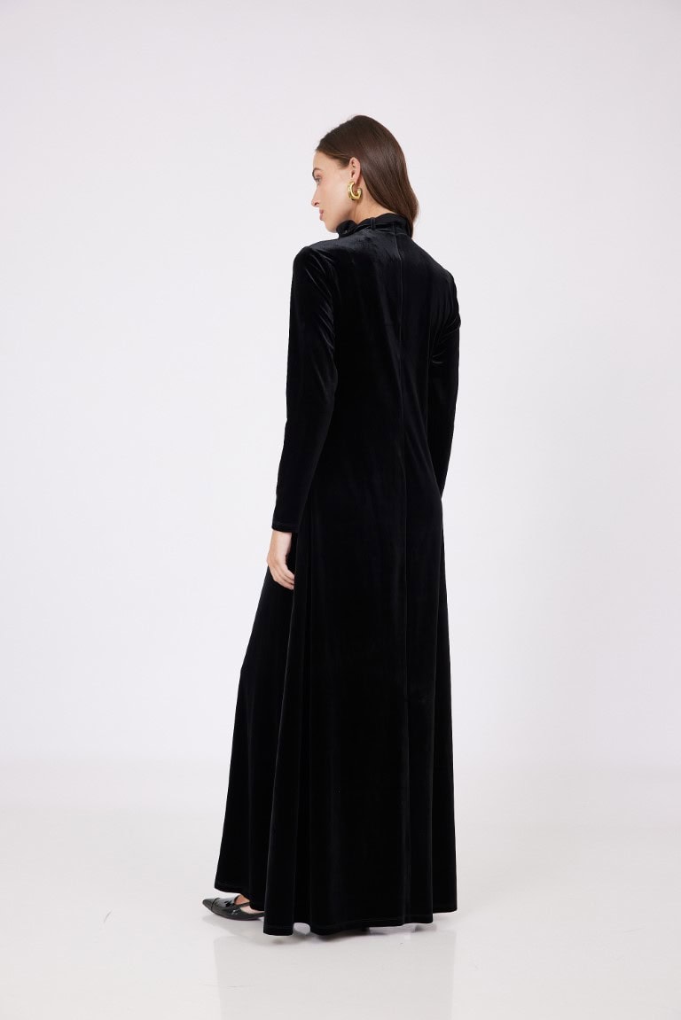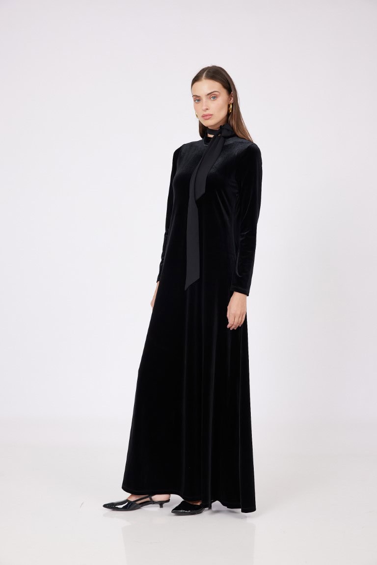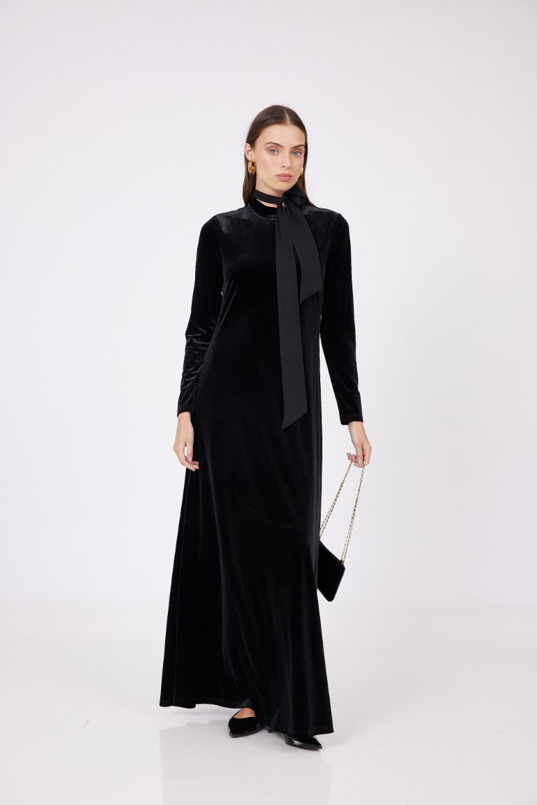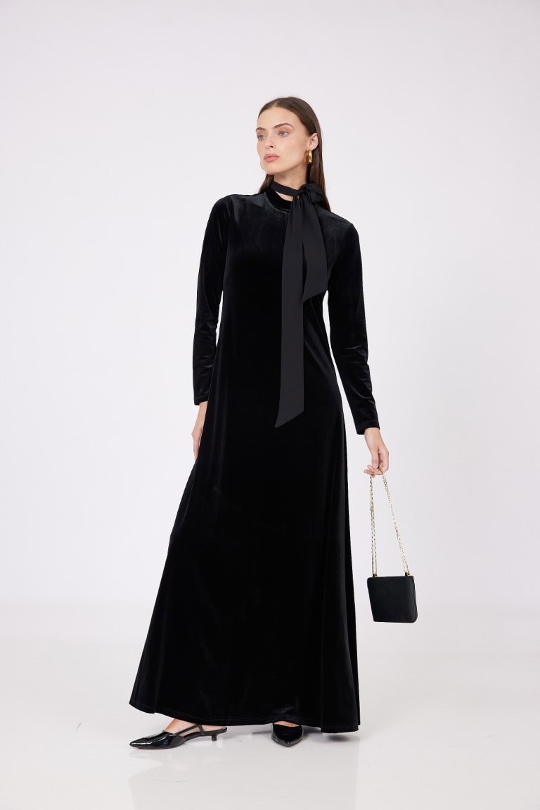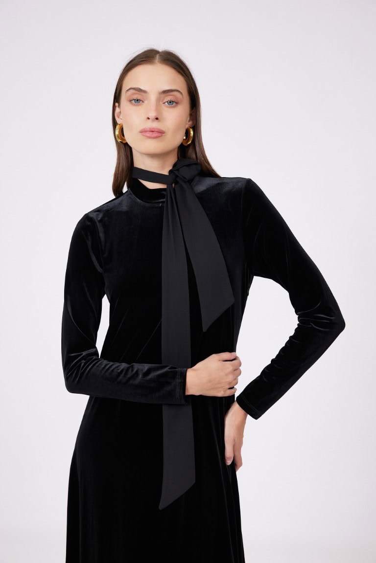 שמלת קטיפה שחורה אלגנטית עם קשירה עדינה בצוואר,